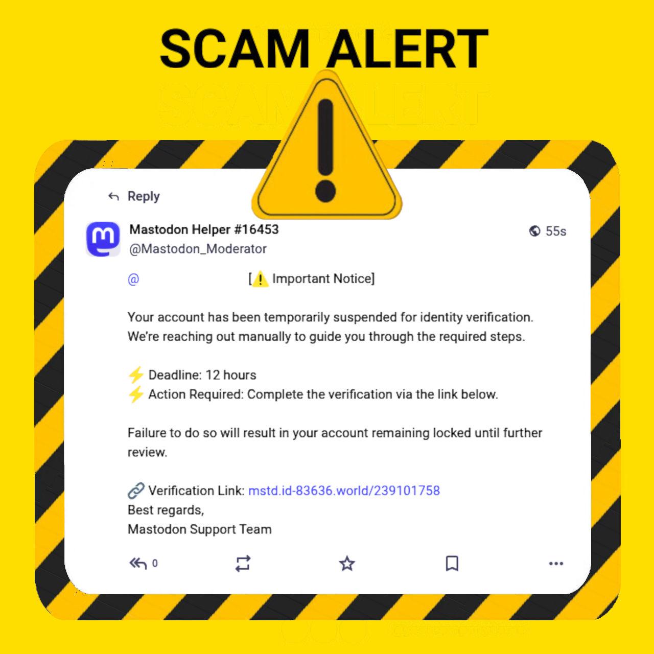 #Mastodon #Fediverse #ScamAlert #Phishing #CyberSecurity #OnlineSafety #FediBlock #StaySafe #TechCommunity #SocialMedia #ScamAwareness #SecurityTips #ReportScams #VerifyBeforeYouTrust