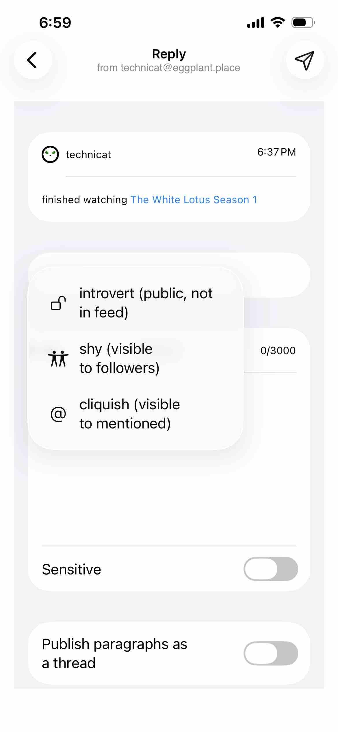 first #Fedicat build of the year enforces thread etiquette of making only the first post public in feeds