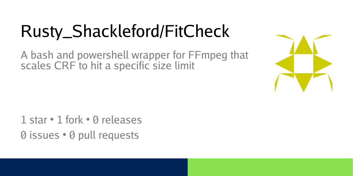 <p>To-Do:<br>Fix final render loop - broken :(</p><p>FitCheck: A bash & powershell wrapper for FFmpeg that scales CRF to hit a specific size limit</p><p><a href="https://codeberg.org/Rusty_Shackleford/FitCheck" rel="nofollow" class="ellipsis" title="codeberg.org/Rusty_Shackleford/FitCheck"><span class="invisible">https://</span><span class="ellipsis">codeberg.org/Rusty_Shackleford</span><span class="invisible">/FitCheck</span></a></p><p>Works anywhere FFmpeg is available<br>Video demo in readme</p><p><a href="/tags/loops/" rel="tag">#loops</a> <a href="/tags/codeberg/" rel="tag">#codeberg</a> <a href="/tags/git/" rel="tag">#git</a> <a href="/tags/unlicense/" rel="tag">#unlicense</a> <a href="/tags/video/" rel="tag">#video</a> <a href="/tags/editing/" rel="tag">#editing</a> <a href="/tags/tool/" rel="tag">#tool</a> <a href="/tags/utility/" rel="tag">#utility</a> <a href="/tags/fediverse/" rel="tag">#fediverse</a> <a href="/tags/cdn/" rel="tag">#cdn</a> <a href="/tags/peertube/" rel="tag">#peertube</a> <a href="/tags/windows/" rel="tag">#windows</a> <a href="/tags/linux/" rel="tag">#linux</a> <a href="/tags/macos/" rel="tag">#macos</a> <a href="/tags/ffmpeg/" rel="tag">#ffmpeg</a> <a href="/tags/videoediting/" rel="tag">#videoediting</a> <a href="/tags/bitrate/" rel="tag">#bitrate</a> <a href="/tags/mastodon/" rel="tag">#mastodon</a> <a href="/tags/pixelfed/" rel="tag">#pixelfed</a></p>