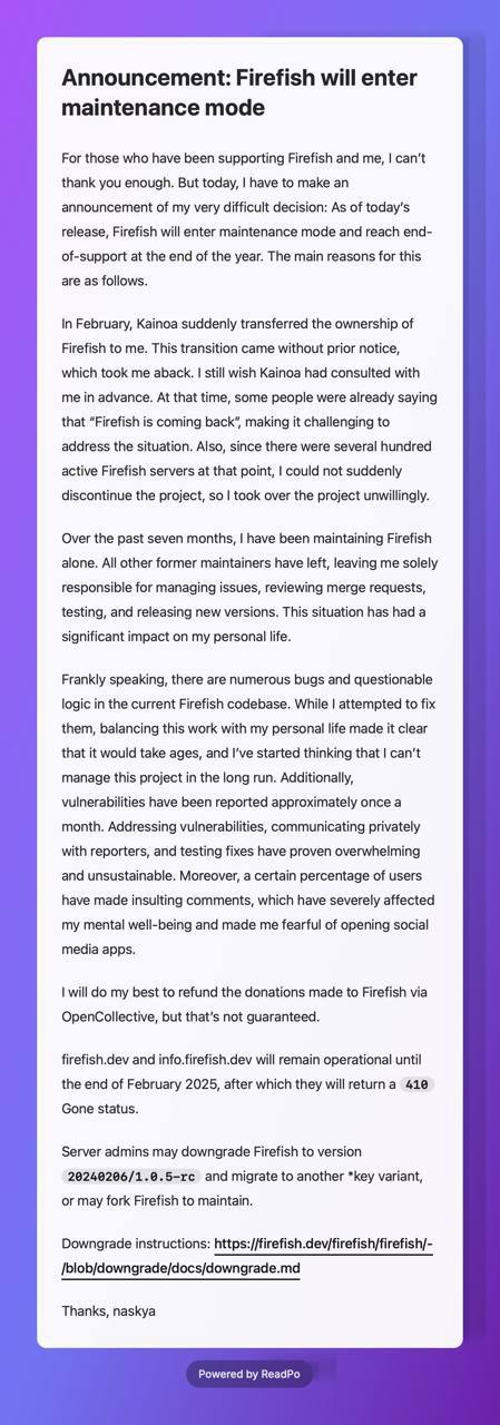 似乎是初始的开发者跑路并甩给了开发人员中的一位,这位开发者惊讶之余,因不堪技术上和心理上的重负,从而正式宣布Firefish停止维护。