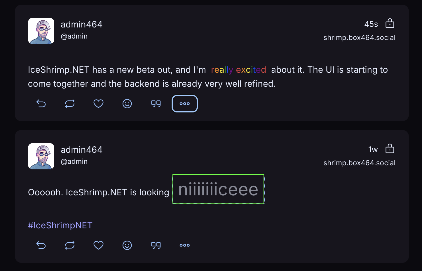 IceShrimp.NET has a new beta release, and the front end UI is starting to catch up to the back end. Including everyone's favorite, MFM! (Well, maybe not everybody, but between instances with support, it sure is fun in moderation)