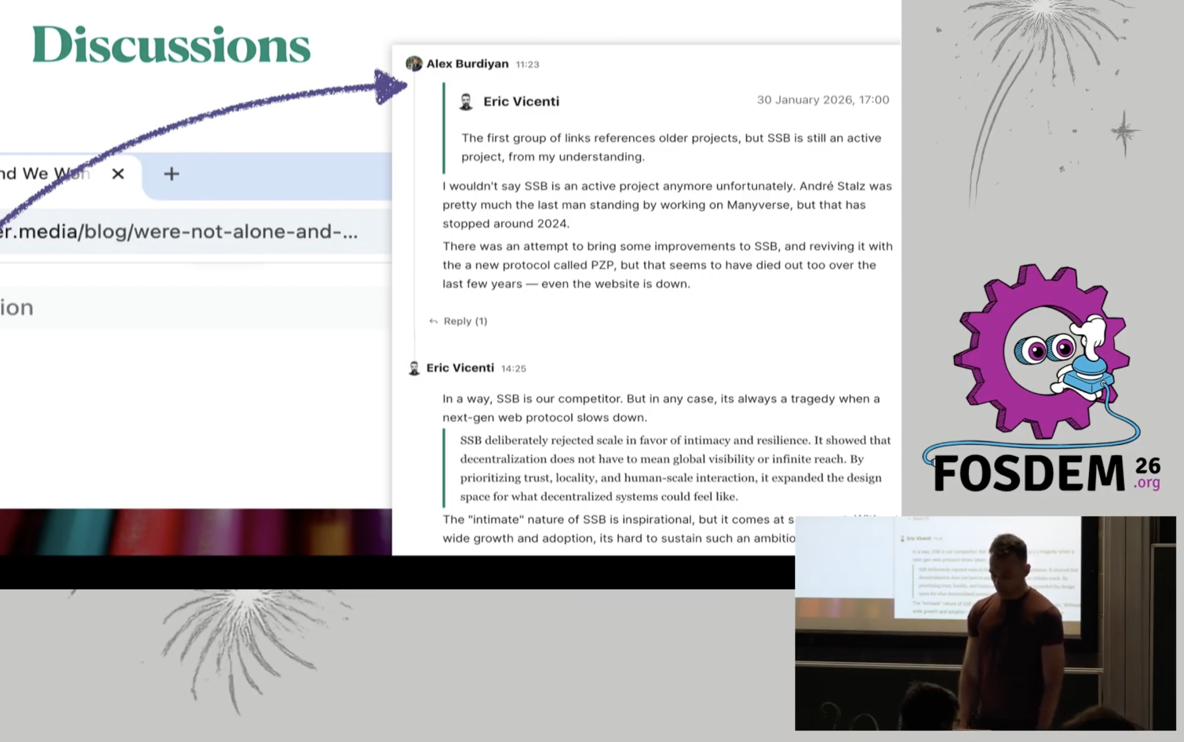 just watched this #FOSDEM #OpenLocalFirst Devroom presentation about https://hyper.media; a new attempt at a p2p web protocol with reading/writing, archiving and web of trust as primitives