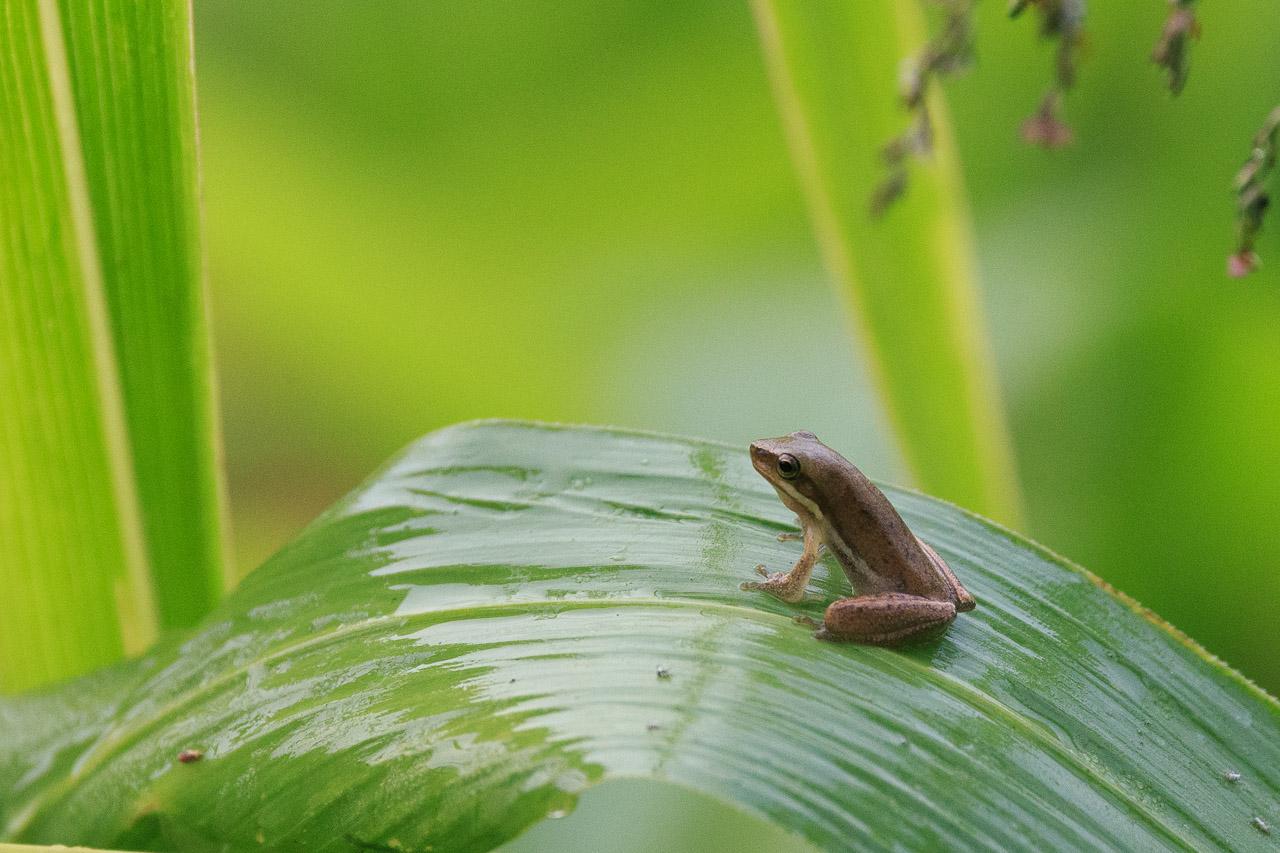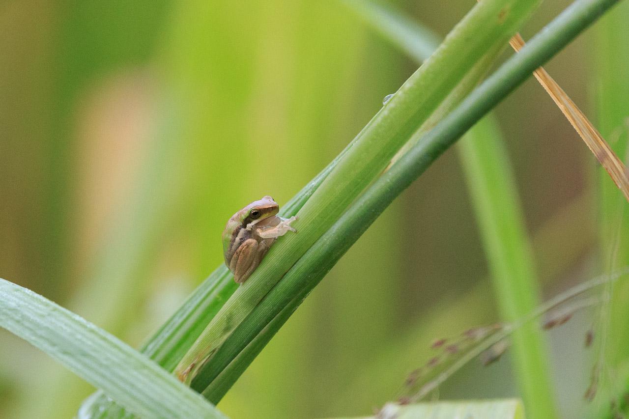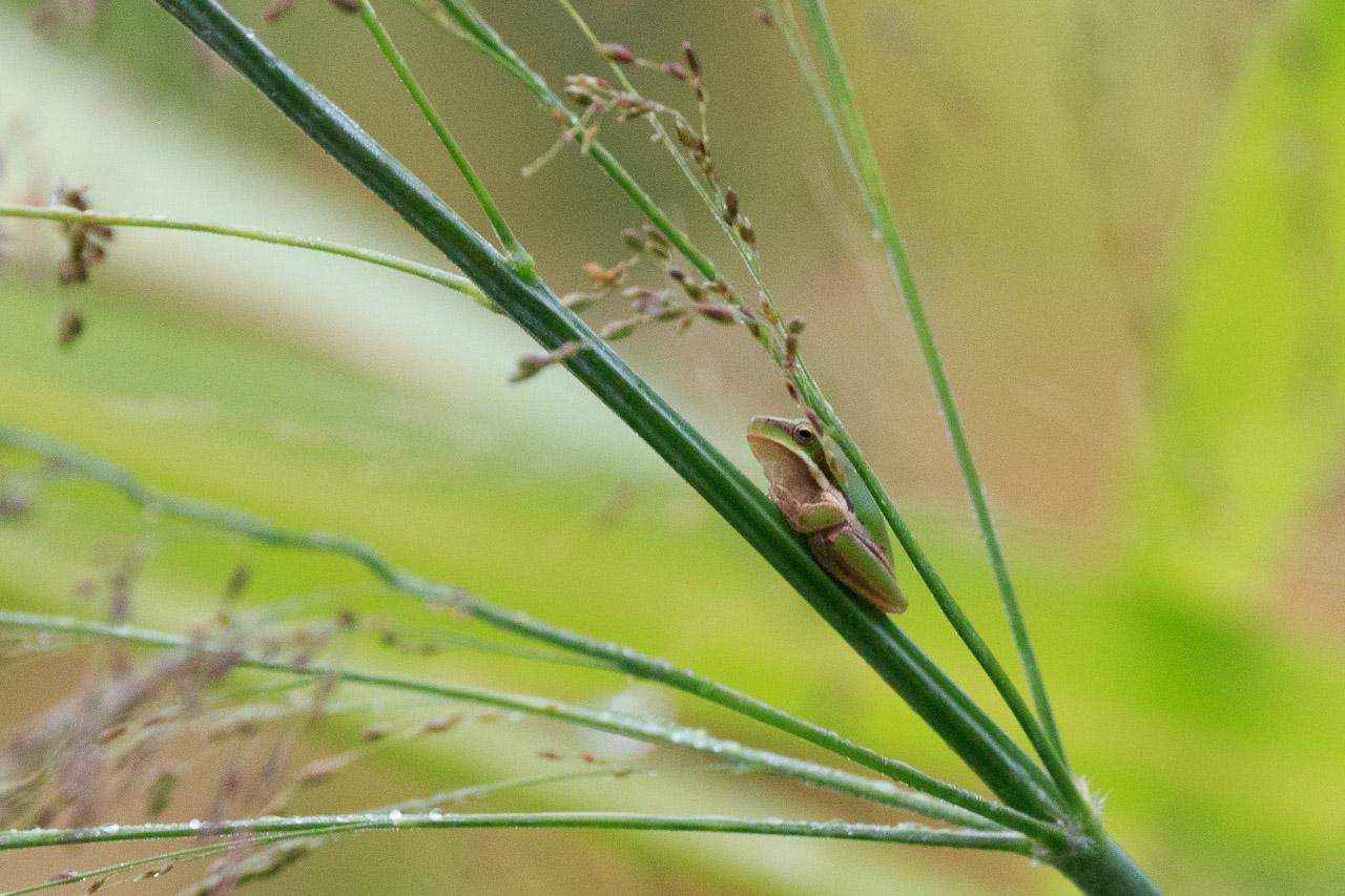 Eastern Dwarf Tree Frogs, mostly perched on guinea grass.