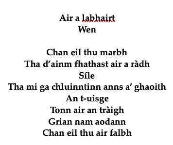 <p><a href="/tags/verse/" rel="tag">#verse</a> <a href="/tags/gàidhlig/" rel="tag">#Gàidhlig</a> <a href="/tags/gaelic/" rel="tag">#Gaelic</a> <a href="/tags/poemaday/" rel="tag">#PoemADay</a> <a href="/tags/smallpoems/" rel="tag">#SmallPoems</a></p>