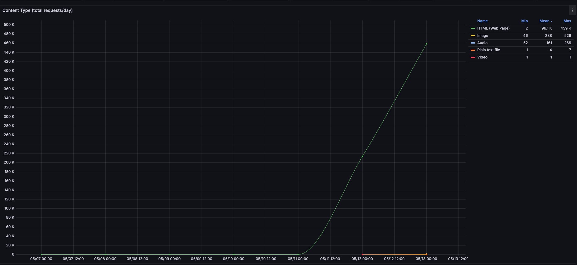 Here's a graph of total daily requests from that 1 GenAI crawler by content-type. You'll note, they've retrieved ~460k web pages in ~16 hours, so a mean of ~28,750 web pages per hour. They'll likely pull ~690k pages today, ~32GB egress.