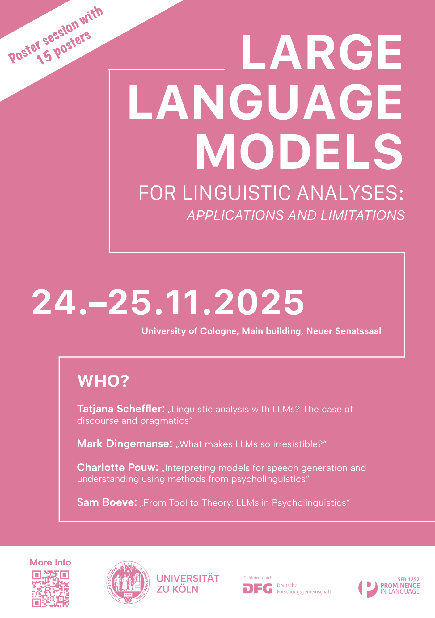 Today and tomorrow colleagues and I are organising a two-day workshop on the use of LLMs for linguistics research at @UniKoeln: https://sfb1252.github.io/llm-workshop/. This was originally intended as a small, university-internal event, but we have found that there is a lot of interest from colleagues and students about this topic so we are delighted to have 15 poster presentations, in addition to four brilliant keynote speakers, and a concluding panel discussion. 1/🧵