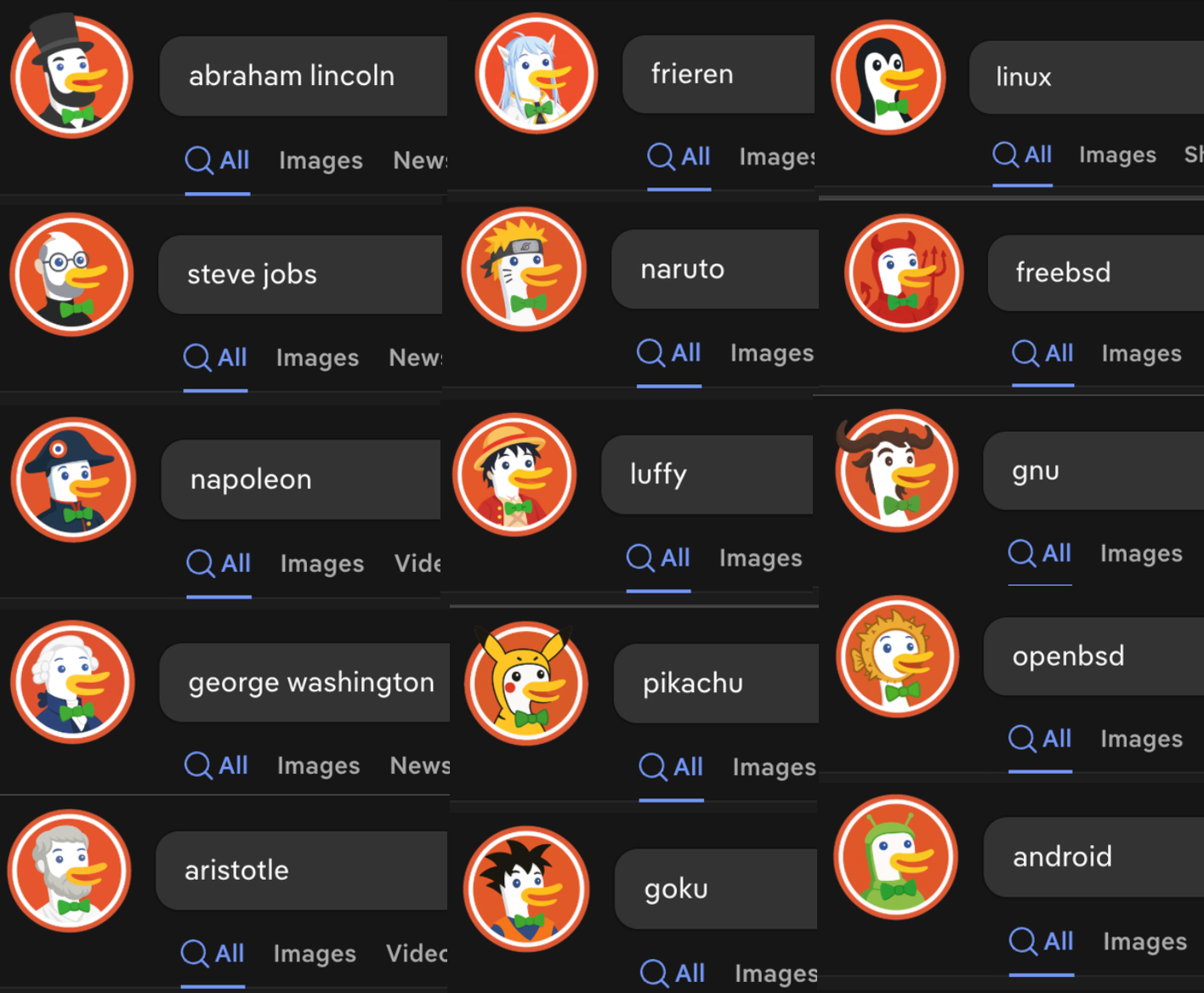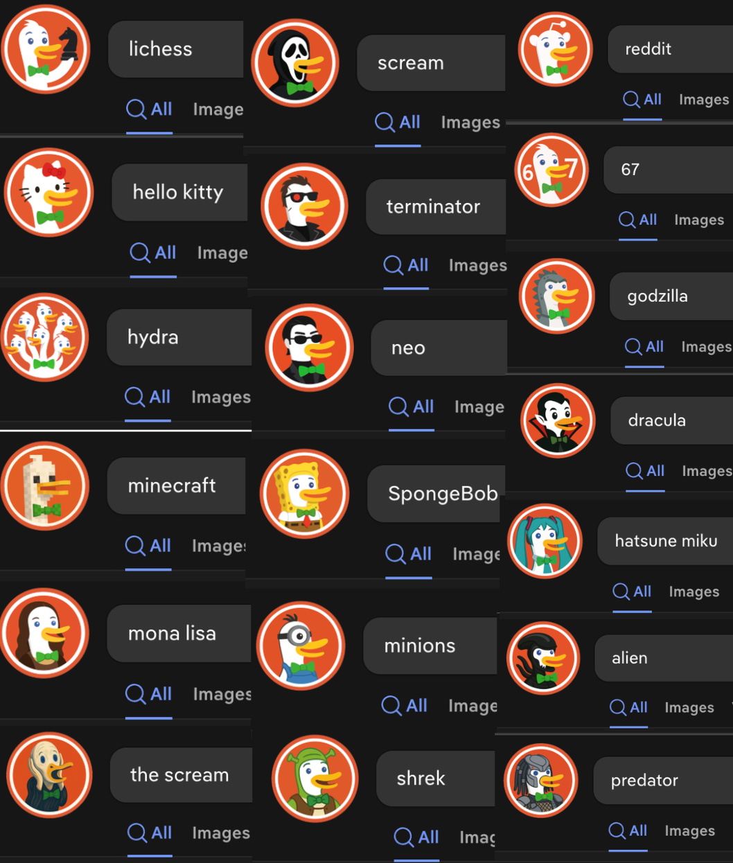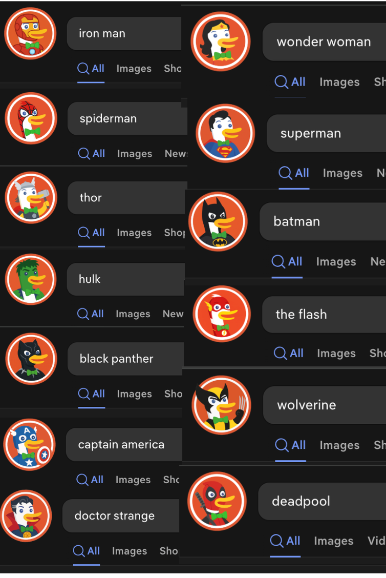 <p>duckduckgo.com 整新活,搜索特定内容,小鸭子会改变图标</p><p>目前我找到了:<br>开源区:Linux Freebsd GNU Openbsd Android<br>日文化区:芙莉莲、鸣人、路飞、皮卡丘、悟空、Miku<br>名人区:林肯、乔布斯、拿破仑、华盛顿、亚里士多德<br>漫威:钢铁侠、蜘蛛侠、索尔、浩克、黑豹、美国队长、奇异博士<br>DC:神奇女侠、超人、蝙蝠侠、闪电侠<br>X战警:金刚狼、死侍<br>动画片区:海绵宝宝、小黄人、怪物史莱克<br>电影区:异形、铁血战士、黑客帝国neo、惊声尖叫 、哥斯拉<br>名作区:蒙娜丽莎、尖叫<br>传说区:九头蛇<br>游戏区:Minecraft、Lichess<br>软件区:Reddit<br>文化区:67(抽象梗)<br>玩具区:Hello Kitty<br>......</p><p><a href="/tags/duckduckgo/" rel="tag">#duckduckgo</a> <a href="/tags/linux/" rel="tag">#linux</a> <a href="/tags/gnu/" rel="tag">#gnu</a> <a href="/tags/design/" rel="tag">#design</a> <a href="/tags/opensource/" rel="tag">#opensource</a> <span class="h-card"><a href="https://ovo.st/club/board" class="u-url mention" rel="nofollow noopener noreferrer" target="_blank">@<span>board</span></a></span></p>