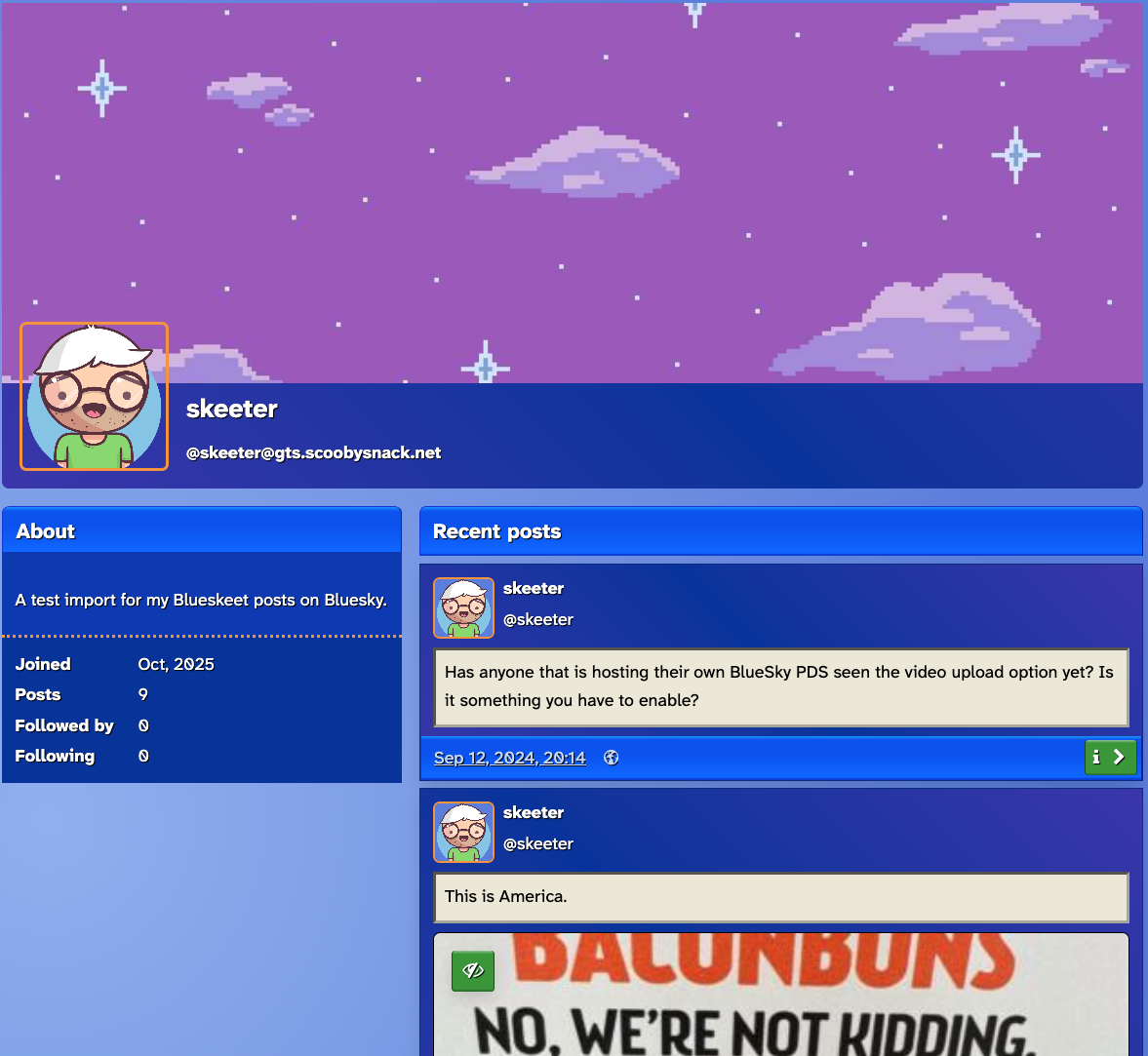 The GoToSocial post import tool, slurp, now supports BlueSky post and media imports, backdated and all. I even used a custom PDS.