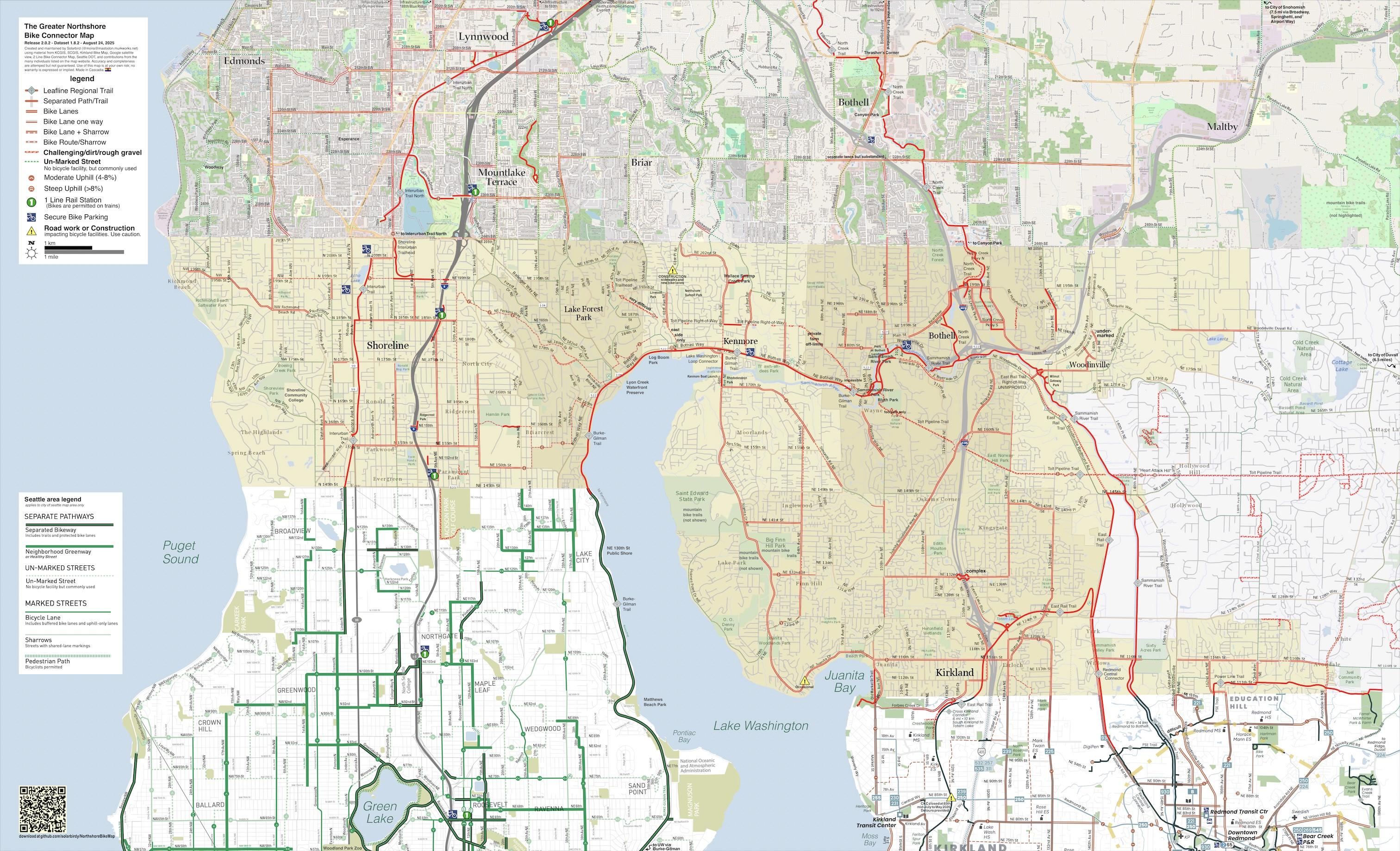 Updates this release are include an extension north of bike lanes on NE 124th Ave, but more importantly, closure information updates for the Sammamish River Trail in Woodinville, and the southern leg of the CKC in Kirkland.