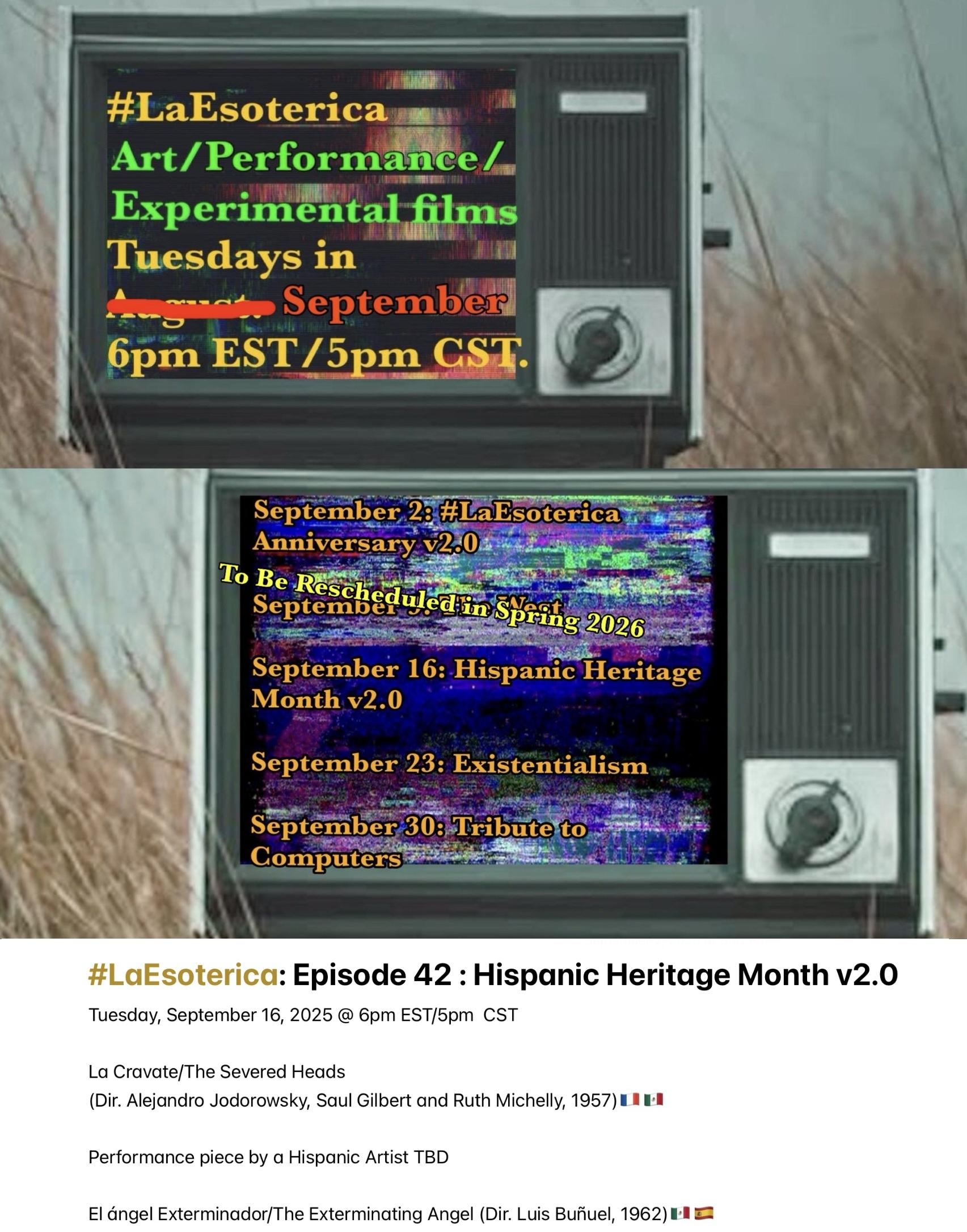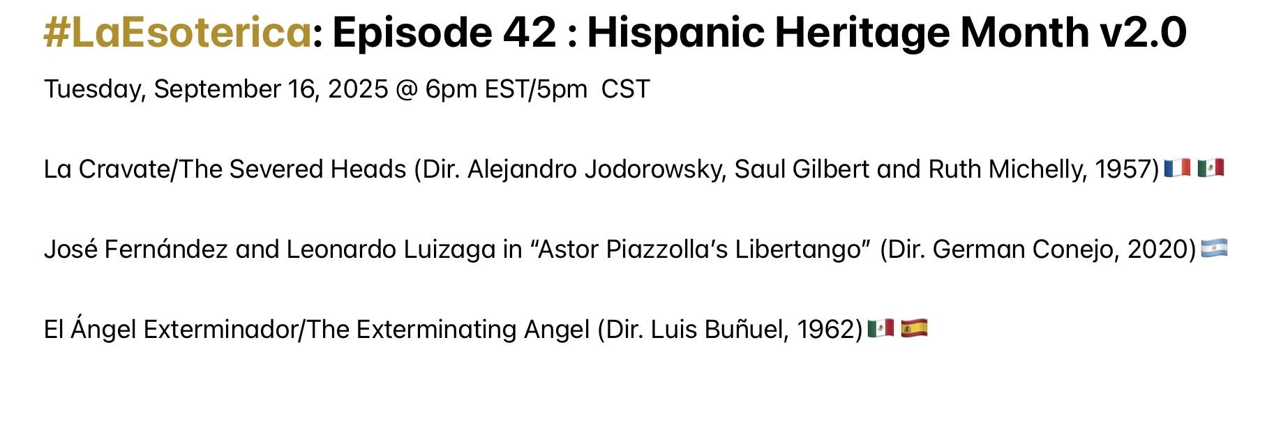 Join me Tuesday @ 6pm EST/5pm CST when #LaEsoterica explores film and performances by Hispanic artists in honor of #HispanicHeritageMonth. Feature presentation “El Ángel Exterminador” (1962)🇲🇽. Playlist available here (https://youtube.com/playlist?list=PL2Zslnc5XTfvDll90m5evr0koBrHi1-MB&si=XeSuRWKCOeNy8ofr) /“El Ángel Exterminador” (1962)🇲🇽 available w/ English subtitles on CriterionChannel and here (https://ok.ru/video/8953907645134) I hope to see you there!