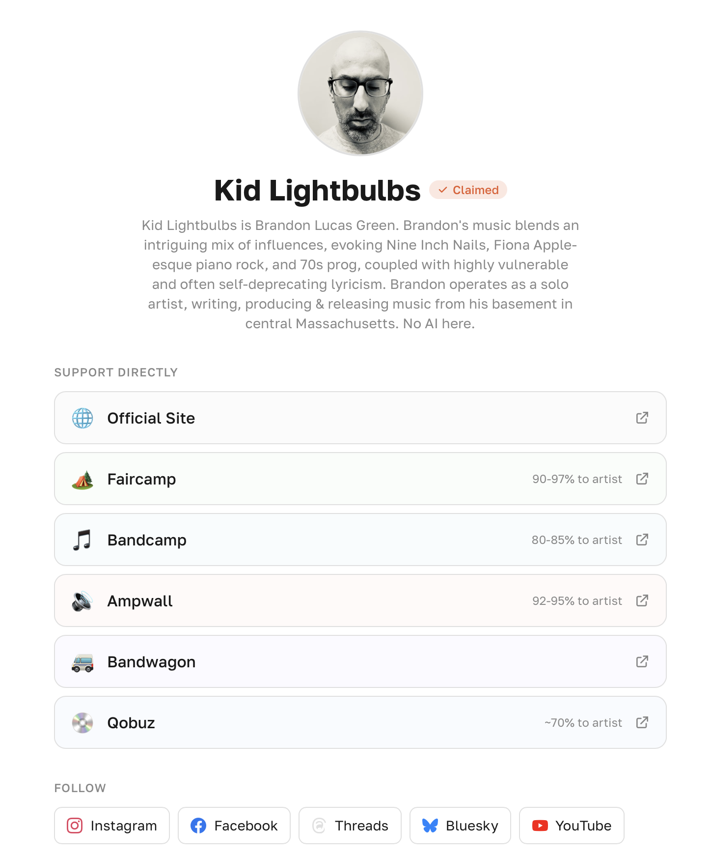 <p>Okay, a couple of fun things I'm working on for <a href="/tags/unstream/" rel="tag">#unstream</a> right now:</p><p>- true artist pages & a process to claim them<br>- artist page customization - curate your platform links, add a bio, add a featured release<br>- embeds<br>- a simple directory of verified indie artists</p><p><a href="/tags/fairtrademusic/" rel="tag">#fairtrademusic</a> <a href="/tags/indiemusic/" rel="tag">#indiemusic</a> <a href="/tags/faircamp/" rel="tag">#faircamp</a> <a href="/tags/bandcamp/" rel="tag">#bandcamp</a> <a href="/tags/mirlo/" rel="tag">#mirlo</a> <a href="/tags/bandwagon/" rel="tag">#bandwagon</a></p>