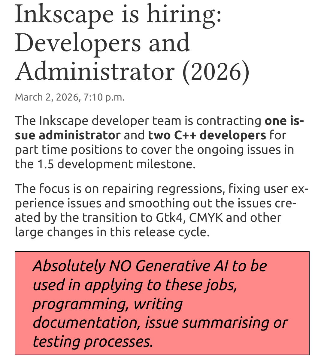 <p><a href="/tags/inkscape/" rel="tag">#Inkscape</a> recrute 2 développeurs C++ et un bugs administrator et le pavé rose est priceless : <a href="/tags/noiagen/" rel="tag">#NoIAGen</a></p><p>L'offre : <a href="https://inkscape.org/news/2026/03/02/inkscape-is-hiring-2026-1/" rel="nofollow" class="ellipsis" title="inkscape.org/news/2026/03/02/inkscape-is-hiring-2026-1/"><span class="invisible">https://</span><span class="ellipsis">inkscape.org/news/2026/03/02/i</span><span class="invisible">nkscape-is-hiring-2026-1/</span></a></p><p><a href="/tags/jerecrute/" rel="tag">#JeRecrute</a> (pas moi)</p><p>Édit : Au passage, saurez-vous trouver le 'AI Trap' ?</p>