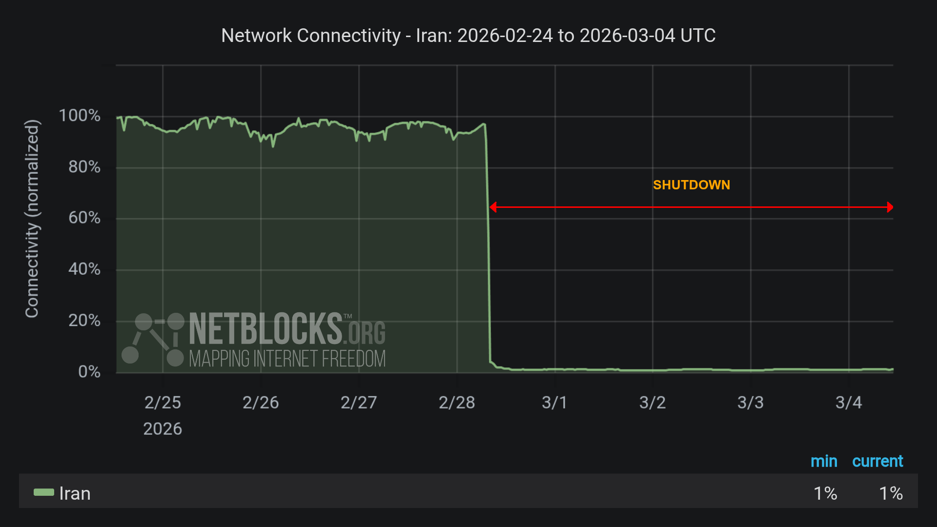 <p>⚠️ Update: <a href="/tags/iran/" rel="tag">#Iran</a> has now been offline for 100 hours. Metrics show internet connectivity flatlining at 1% of ordinary levels as the regional conflict escalates.</p><p>The regime-imposed blackout is the second this year and follows the shutdown in January when thousands were killed.</p>