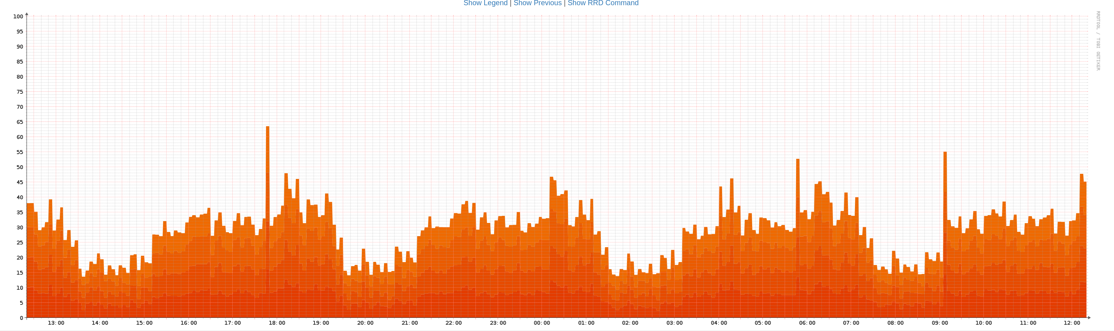 Here is the CPU usage graph for the last 24 hours of the FediMeteo VM. A full 24 hours, during which a huge number of people are connecting, helped by the traction gained from being among the top stories on Hacker News and Lobsters, as well as the many shares across the Fediverse.