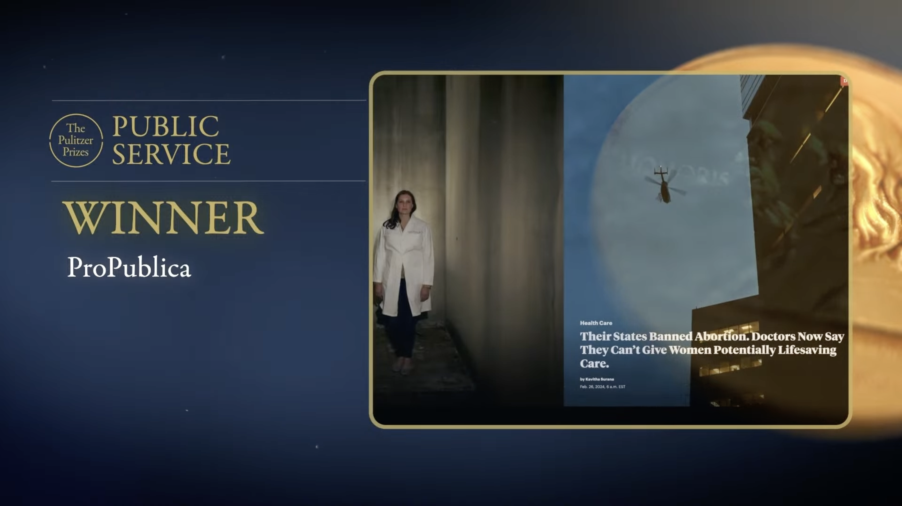 JUST IN: ProPublica’s “Life of the Mother” series, which exposes the fatal consequences of abortion bans, has won the Pulitzer Prize for Public Service.