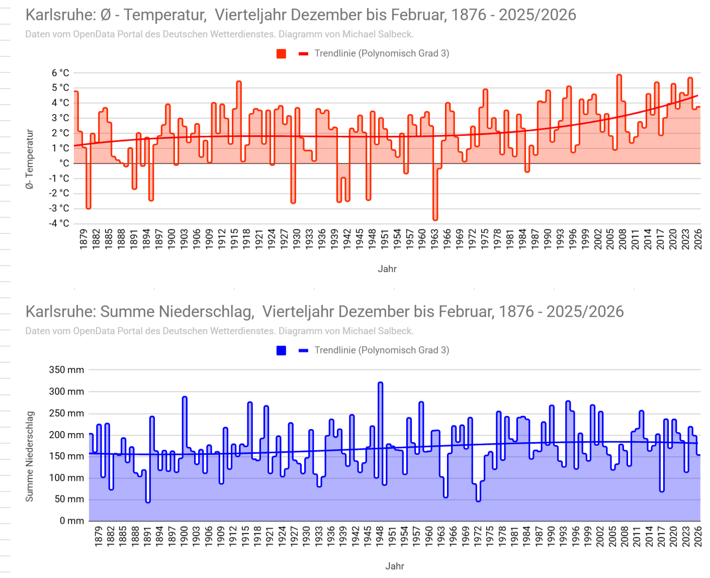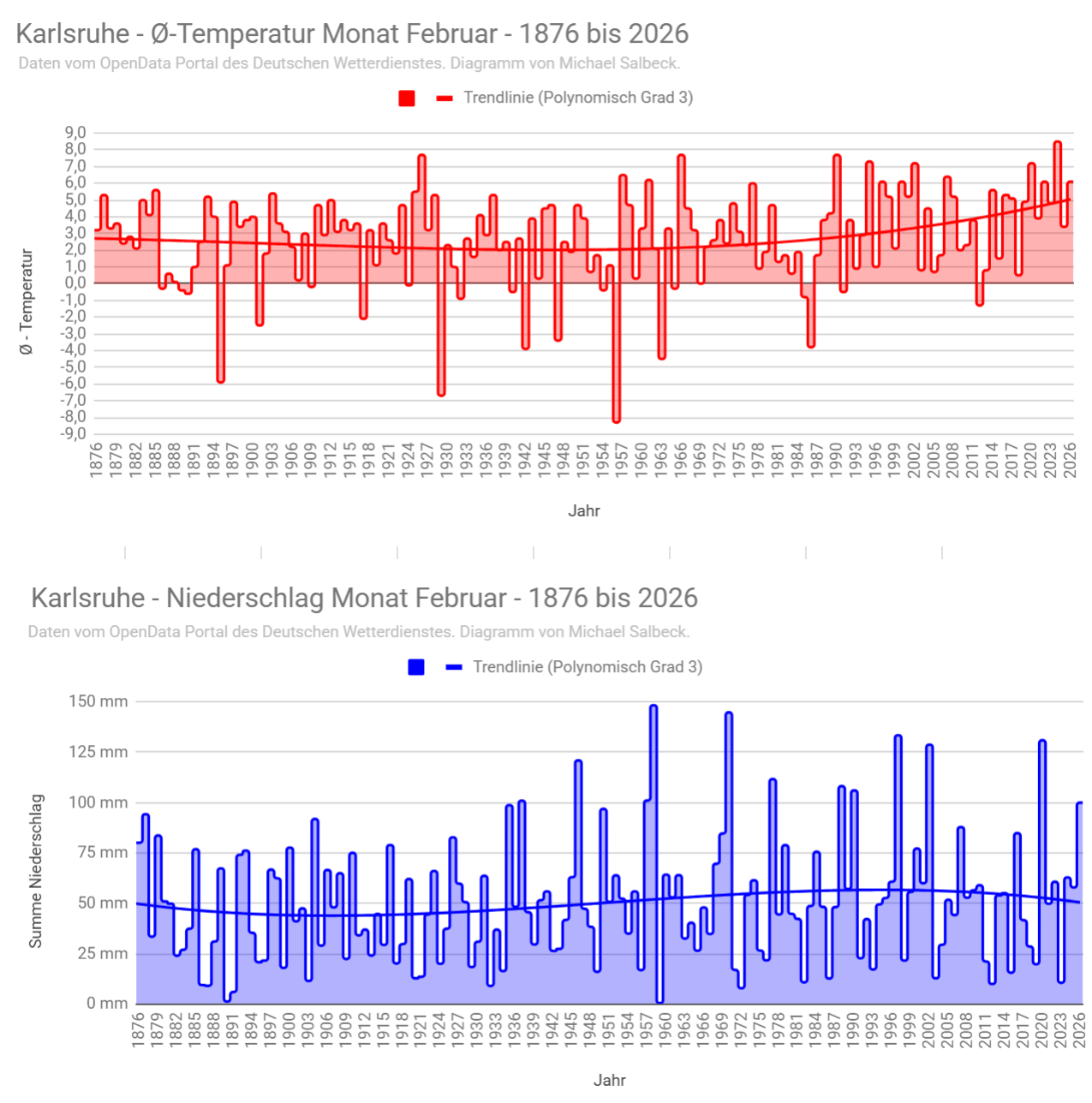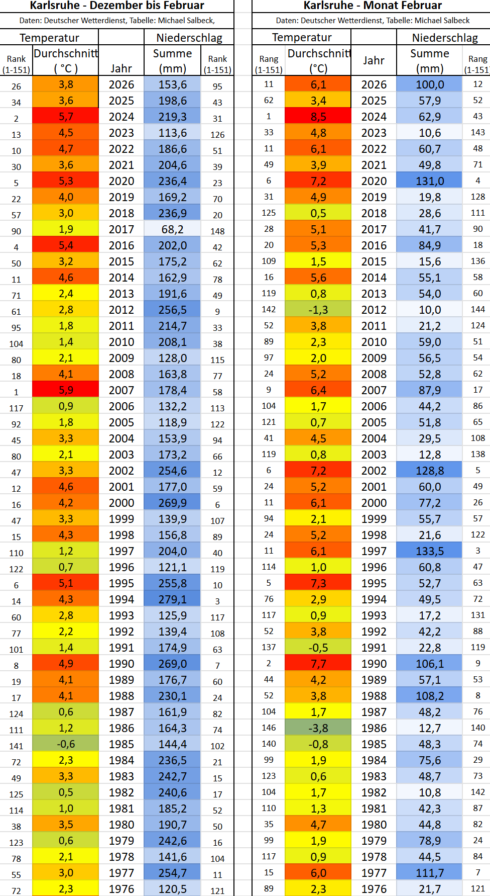 <p><a href="/tags/karlsruhe/" rel="tag">#Karlsruhe</a> </p><p>Die Klimadaten für den Februar und das Vierteljahr Dezember bis Februar.</p><p>Der Februar hat knapp die Top 10 der wärmsten und gleichzeitig niederschlagreichsten Februare seit 1876 verpasst (Platz 11 und 12).</p><p>(Seit 2008 DWD Wetterstation Rheinstetten. Davor in der Nordweststadt/Neureut)<br><a href="/tags/klima/" rel="tag">#Klima</a> <a href="/tags/klimaerwärmung/" rel="tag">#Klimaerwärmung</a> <a href="/tags/klimakrise/" rel="tag">#Klimakrise</a></p>