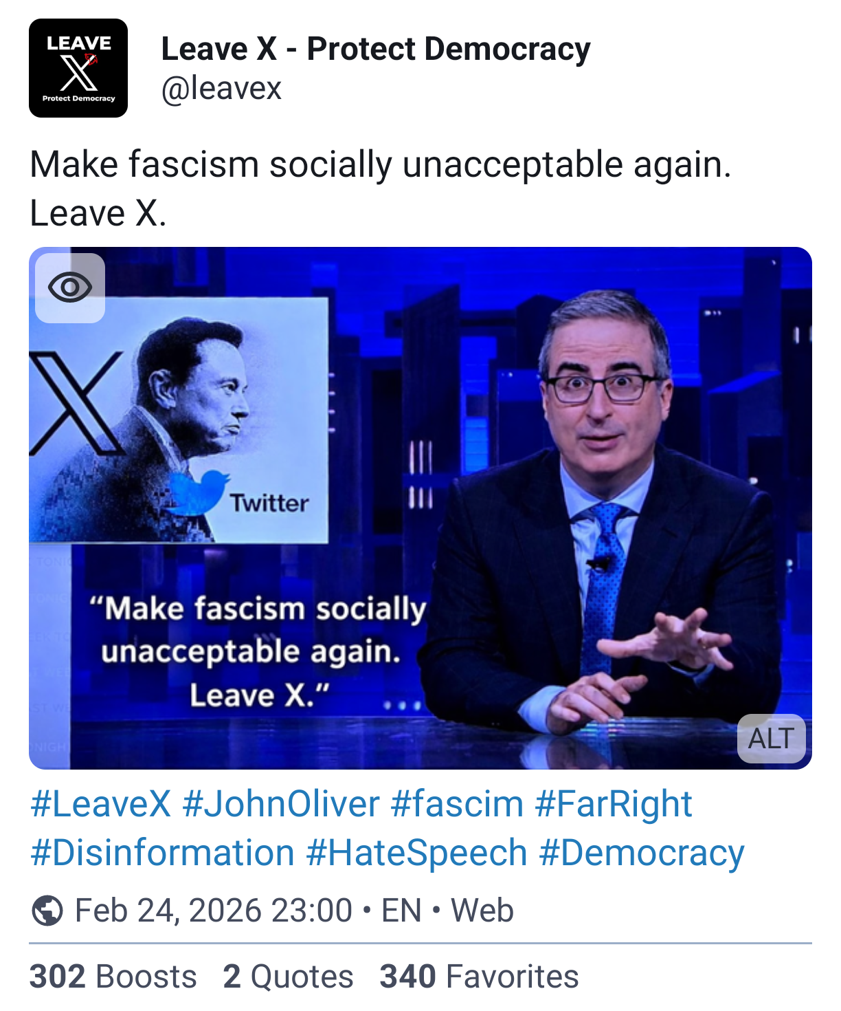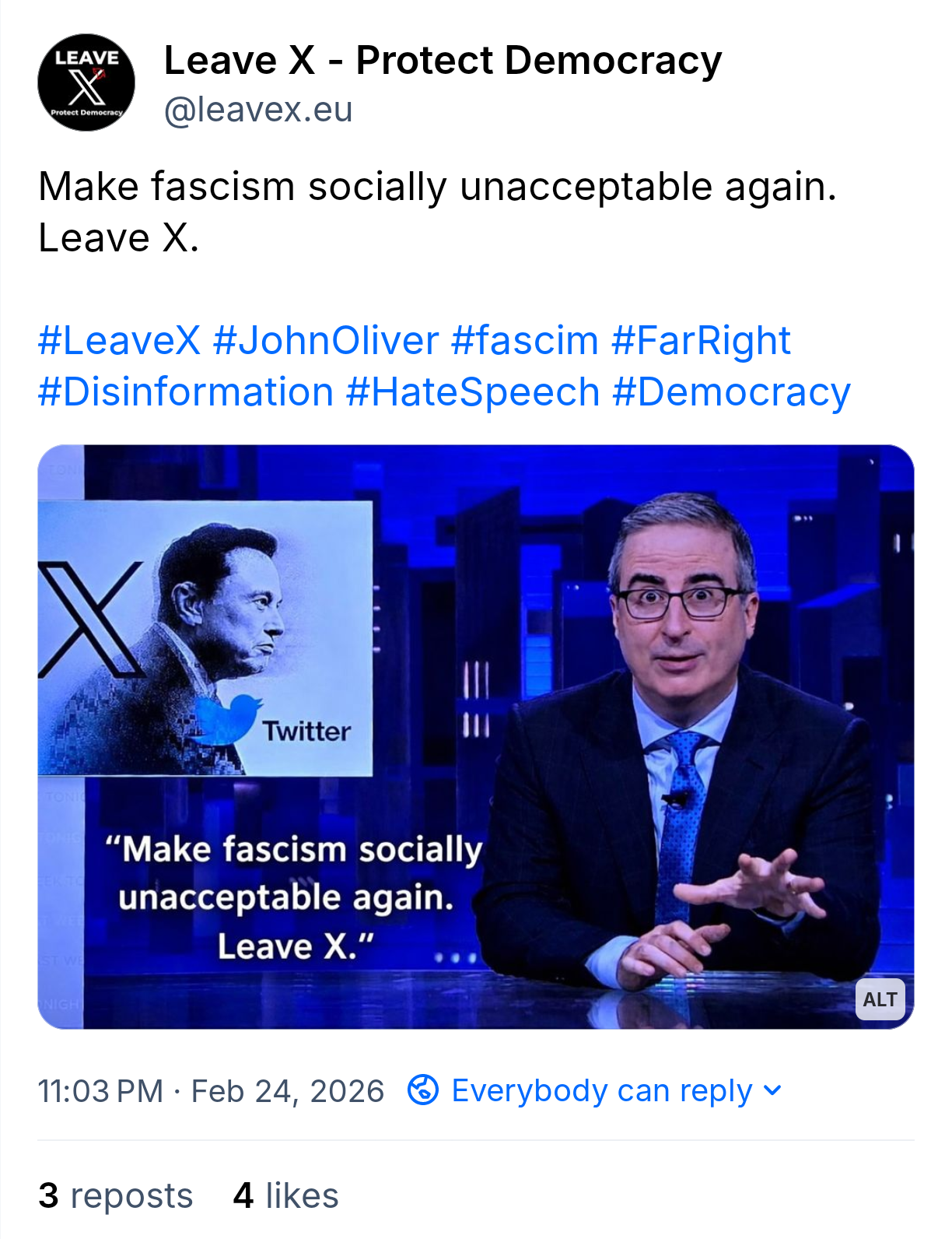 <p>Thanks to <span class="h-card"><a href="https://bonn.social/@zollak" class="u-url mention" rel="nofollow noopener noreferrer" target="_blank">@<span>zollak</span></a></span>, we updated the status of ten MEPs! Now, we have 421 more politicians to persuade to leave X, which is a decrease from 60% to 59%.</p><p>Can we get that number below 50% before spring?</p><p>Contact the MEPs using our tool <a href="https://leavex.eu/politicians/" rel="nofollow"><span class="invisible">https://</span>leavex.eu/politicians/</a></p><p>We should keep track of how many politicians left X by either stating it or deleting their accounts.</p><p>P. S. here is the code with these latest changes <a href="https://github.com/everton137/leavex-tools/commit/d49dd70bd97349adc813ddae0f5982bdddcb97bf" rel="nofollow" class="ellipsis" title="github.com/everton137/leavex-tools/commit/d49dd70bd97349adc813ddae0f5982bdddcb97bf"><span class="invisible">https://</span><span class="ellipsis">github.com/everton137/leavex-t</span><span class="invisible">ools/commit/d49dd70bd97349adc813ddae0f5982bdddcb97bf</span></a></p><p><a href="/tags/leavex/" rel="tag">#LeaveX</a> <a href="/tags/democracy/" rel="tag">#Democracy</a> <a href="/tags/eu/" rel="tag">#EU</a></p>