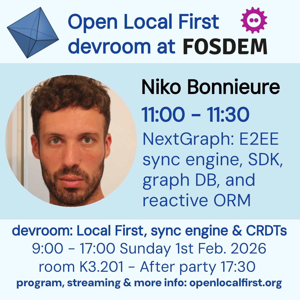 At @fosdem '26 #LocalFirst devroom, @nikobonnieure.bsky.social will present, together with @laurin the latest advances in NextGraph, the framework fitted with a federated and E2EE sync protocol, a graph database, a new Reactive ORM for Svelte, React and VueJS to bind your Automerge, Yjs and RDF documents easily to the frontend.