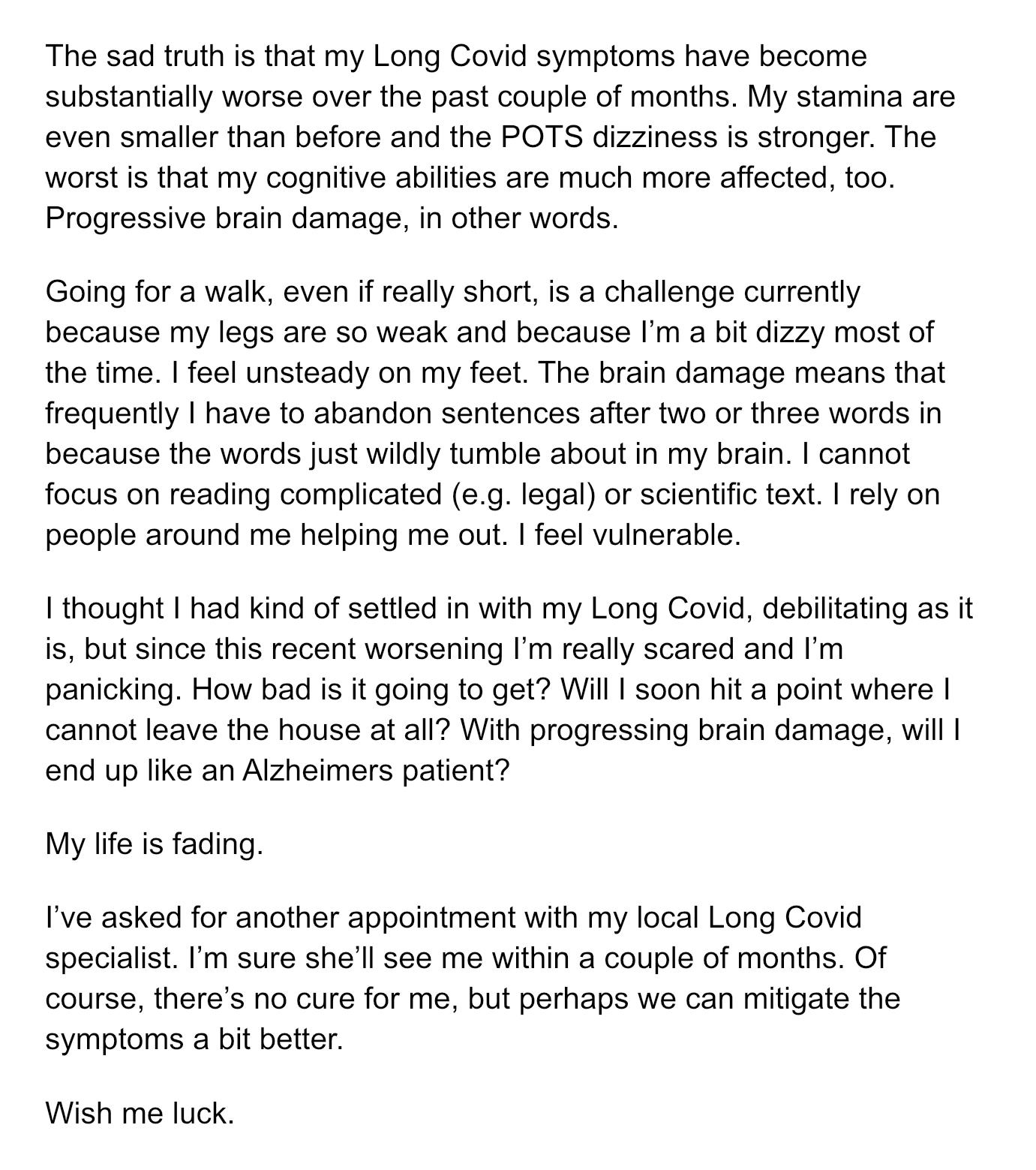 ¿Será aquí donde se diga que hay pocas personas que mueren por coronavirus y que sienten mi muerte pero que a veces pasa? ¿Es aquí donde desarrollo enfermedades y discapacidades más terribles como consecuencia de otra infección por COVID? ¿Es aquí donde mi COVID persistente empeorará?