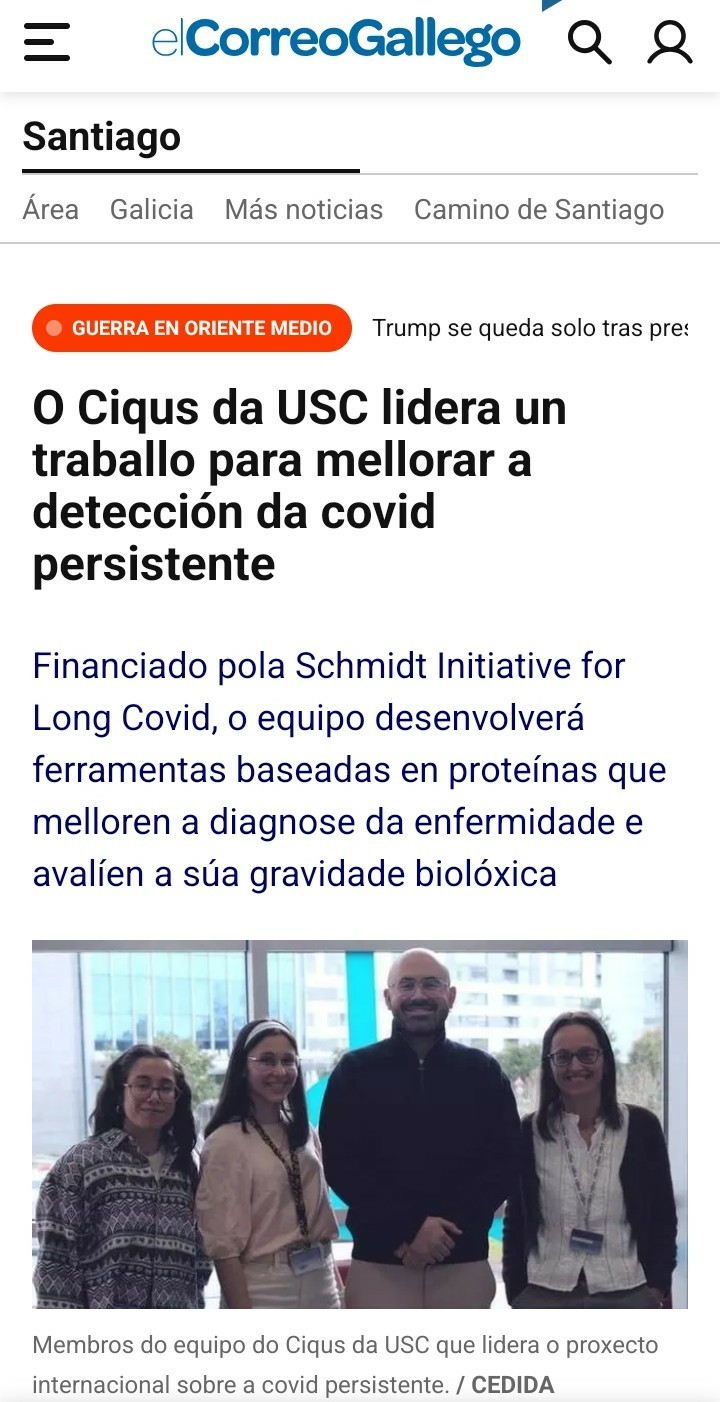 <p>A covid persistente existe.</p><p>O Centro Singular de Investigação em Química Biológica e Materiais Moleculares da Universidade de Santiago de Compostela (Ciqus) lidera um novo proxecto internacional centrado na covid persistente.</p><p><a href="/tags/covid/" rel="tag">#covid</a> <a href="/tags/covidpersistente/" rel="tag">#CovidPersistente</a> <a href="/tags/longcovid/" rel="tag">#LongCovid</a></p>