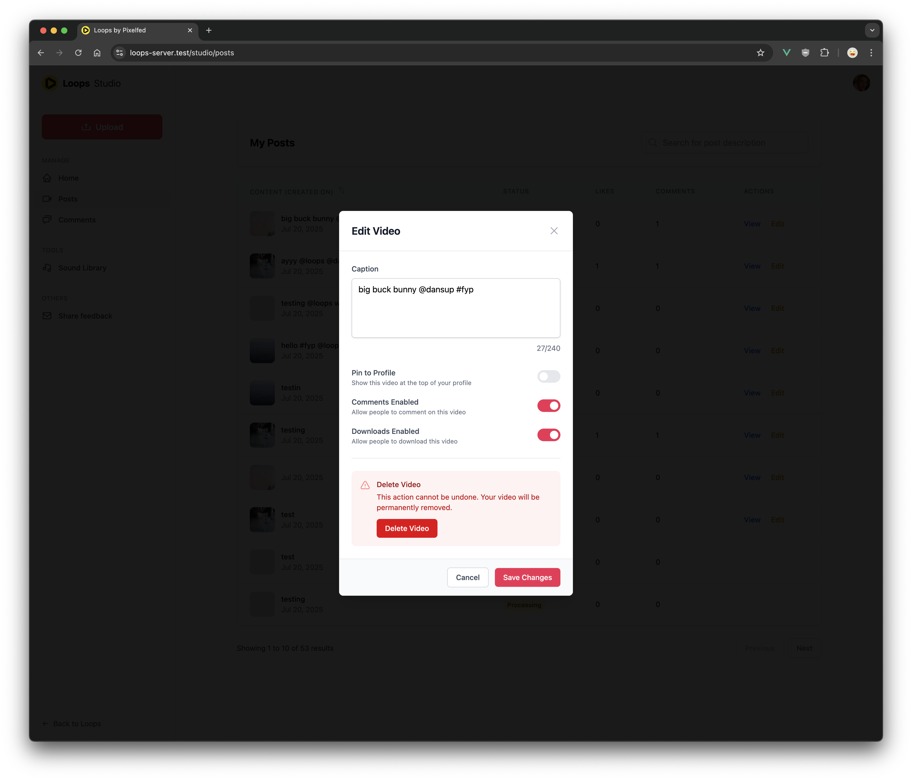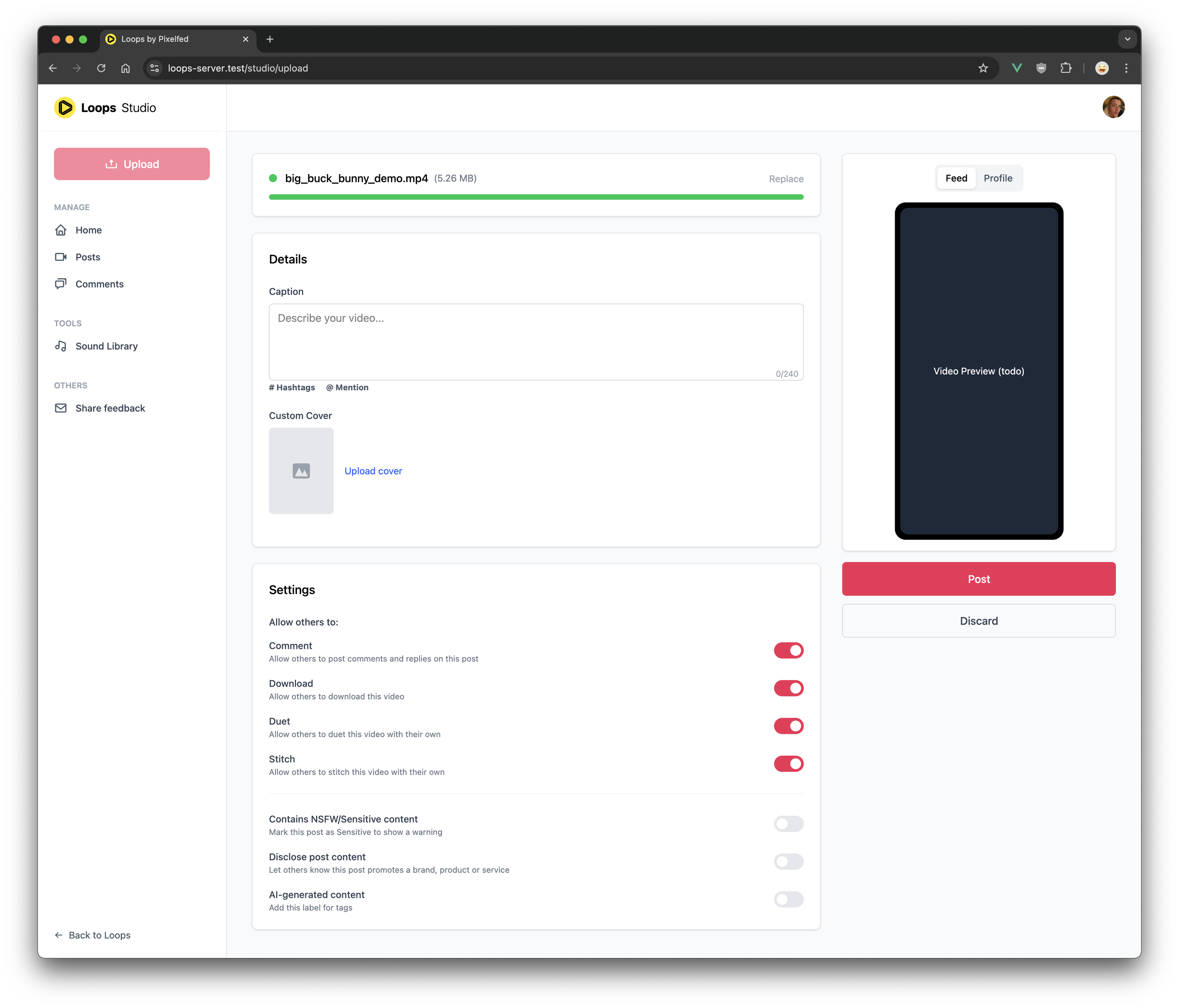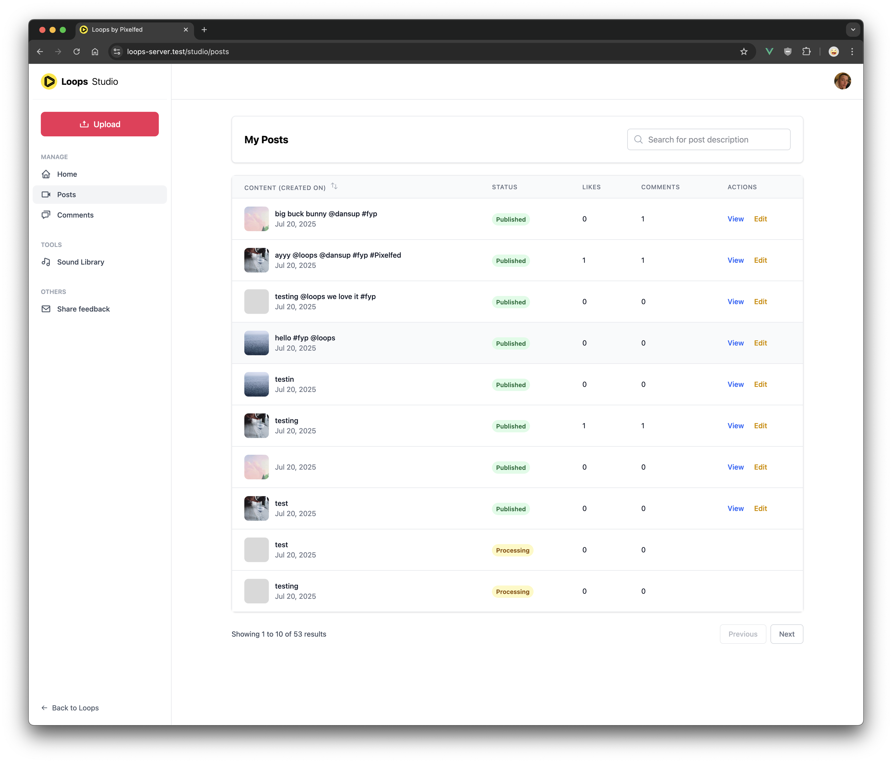 Loops Studio is built for creators, allowing you to upload new content, review and manage your posts, comments and interactions as well as view analytics!
