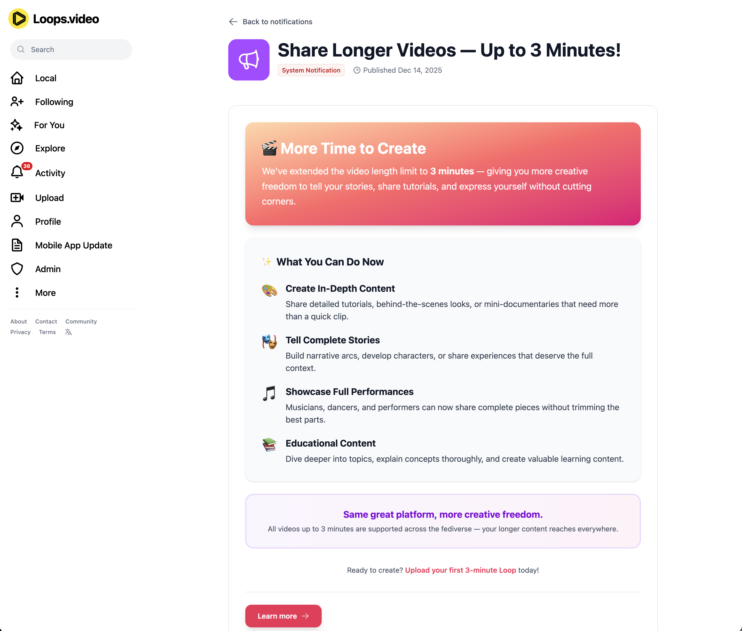 Push Notifications, Longer Videos (3 minutes) and more are coming to Loops later this week, just in time for Christmas 🎄