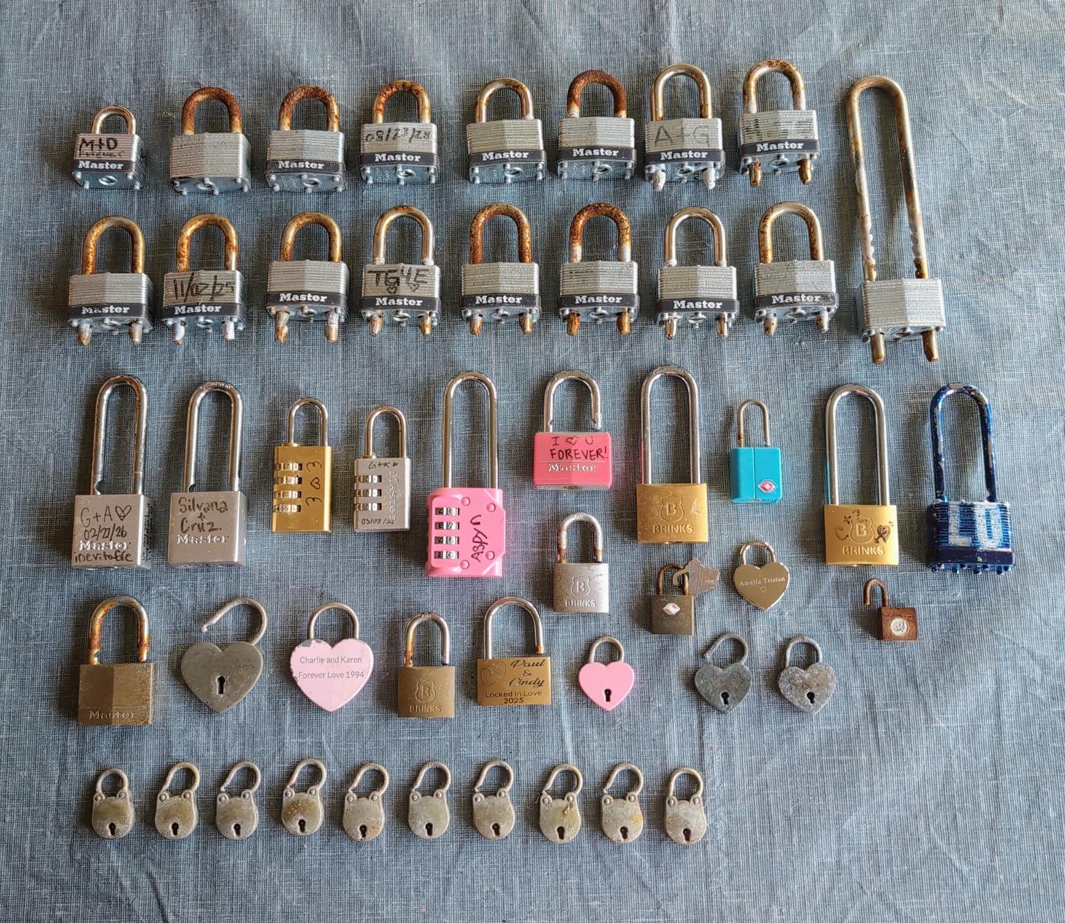 <p>49 more love locks yesterday!</p><p>Which means over 500 in my collection now!</p><p>Which means over half way to the goal!</p><p>---</p><p>InB4 "Why do you steal love locks?"</p><p>1. The city considers them graffiti and abandoned property.</p><p>2. They cause damage to structures.</p><p>3. They rust away and become a hazard.</p><p>4. The city destroys them.</p><p>5. They're my friends, and I love them.</p><p>6. They're all going into a big museum art installation as a celebration of love and locksport.</p><p><a href="/tags/alicepics/" rel="tag">#AlicePics</a> <a href="/tags/locksport/" rel="tag">#Locksport</a> <a href="/tags/love/" rel="tag">#Love</a> <a href="/tags/locks/" rel="tag">#Locks</a></p>