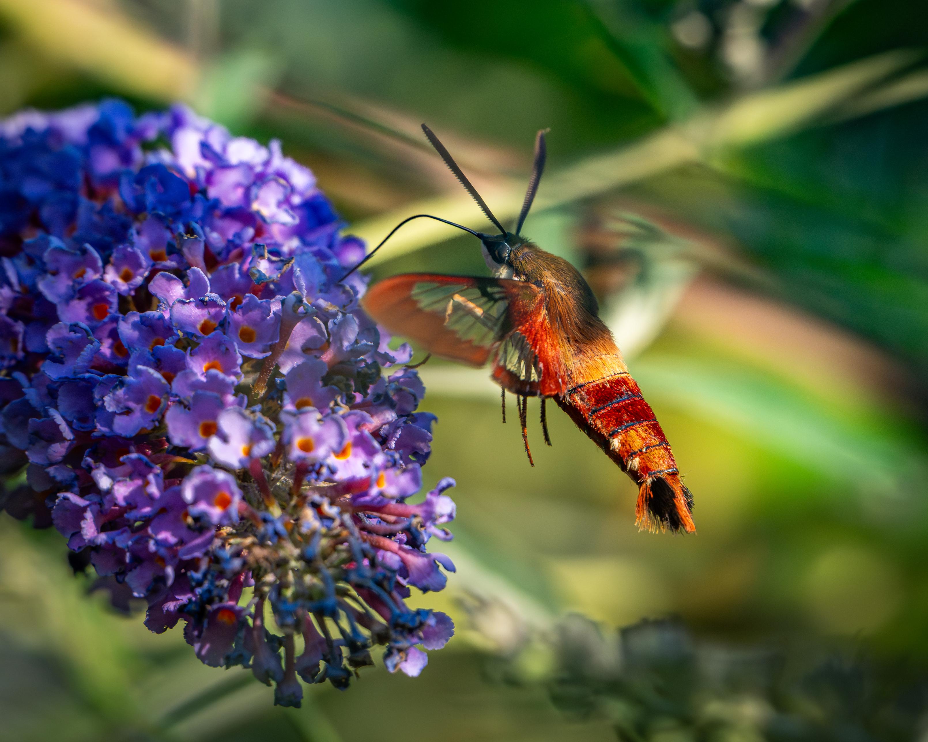 A Hummingbird Moth supping on Butterfly Bush flowers at Mass Audubon's Stony Brook sanctuary.
