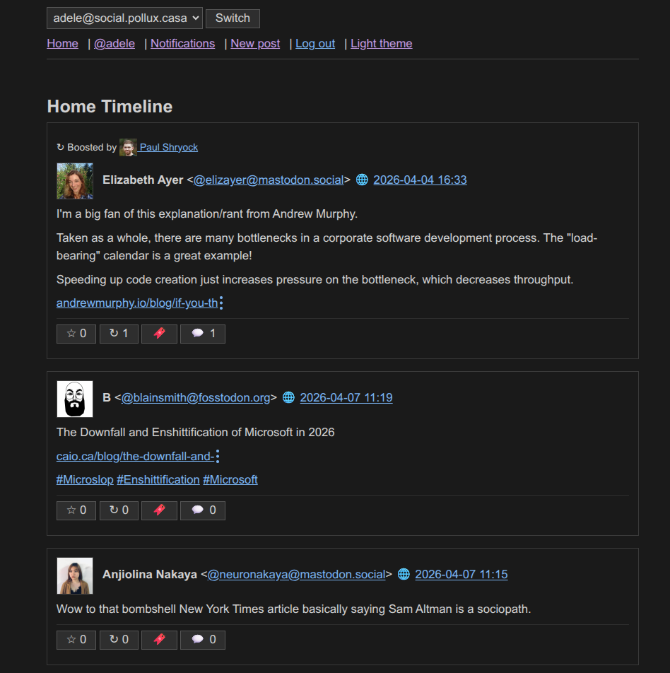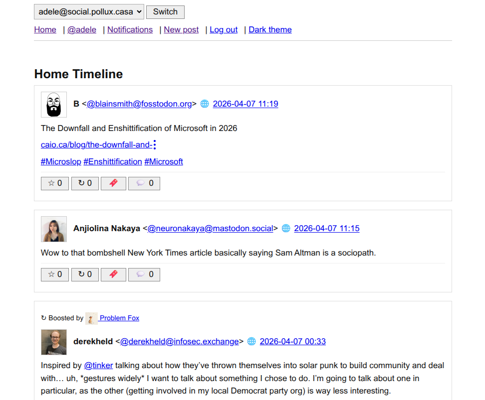 <p>New version of <a href="/tags/smolfedi/" rel="tag">#SmolFedi</a>, a lightweight, no-JavaScript Fediverse client written in PHP. It respects <a href="/tags/smolweb/" rel="tag">#smolweb</a> specs.</p><p>It works fine with all basic browser such as <a href="/tags/netsurf/" rel="tag">#netsurf</a> So you can access Fediverse on <a href="/tags/retro/" rel="tag">#retro</a> computer have a basic browser (need cookies feature).</p><p>You can install it on a simple web server with php8.x / pdo_sqlite / php_curl</p><p><a href="https://codeberg.org/adele/smolfedi" rel="nofollow"><span class="invisible">https://</span>codeberg.org/adele/smolfedi</a></p><p>Test it on <a href="https://smolfedi.pollux.casa/" rel="nofollow"><span class="invisible">https://</span>smolfedi.pollux.casa/</a> and log to all your fediverse instances (tested on <a href="/tags/gotosocial/" rel="tag">#gotosocial</a> and <a href="/tags/mastodon/" rel="tag">#mastodon</a>). You can connect to multiple account and switch between them easily.</p><p><a href="/tags/smallweb/" rel="tag">#smallweb</a> <a href="/tags/fediverse/" rel="tag">#fediverse</a></p>