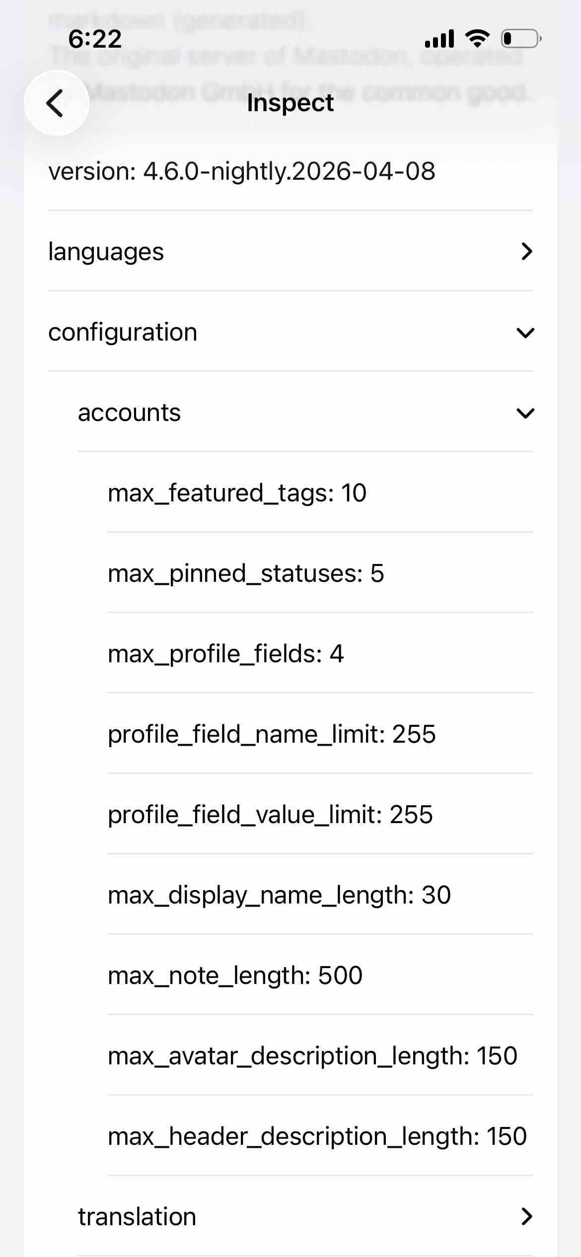 <p>besides the new <a href="/tags/mastodon/" rel="tag">#mastodon</a> profile alt text fields (which are the same as in <a href="/tags/gotosocial/" rel="tag">#gotosocial</a>) there are instance configuration properties for the corresponding max char limits</p>