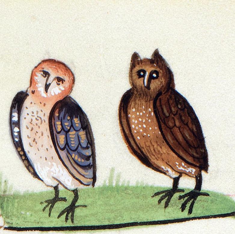 Owls. Frederick II, De arte venandi cum avibus (French version), Bruges ca. 1485-1490. Bibliothèque de Genève, Ms. fr. 170, fol. 106r.
