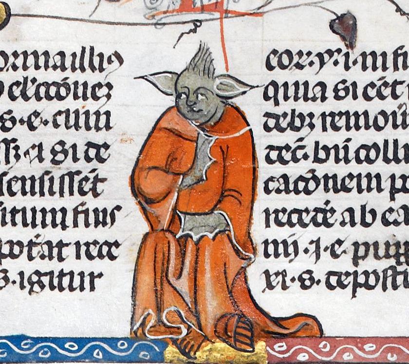 Master #Yoda? ‘The Smithfield Decretals’ (Decretals of Gregory IX with glossa ordinaria), Toulouse ca. 1300, illuminations added in London ca. 1340. British Library, Royal 10 E IV, fol. 30v.