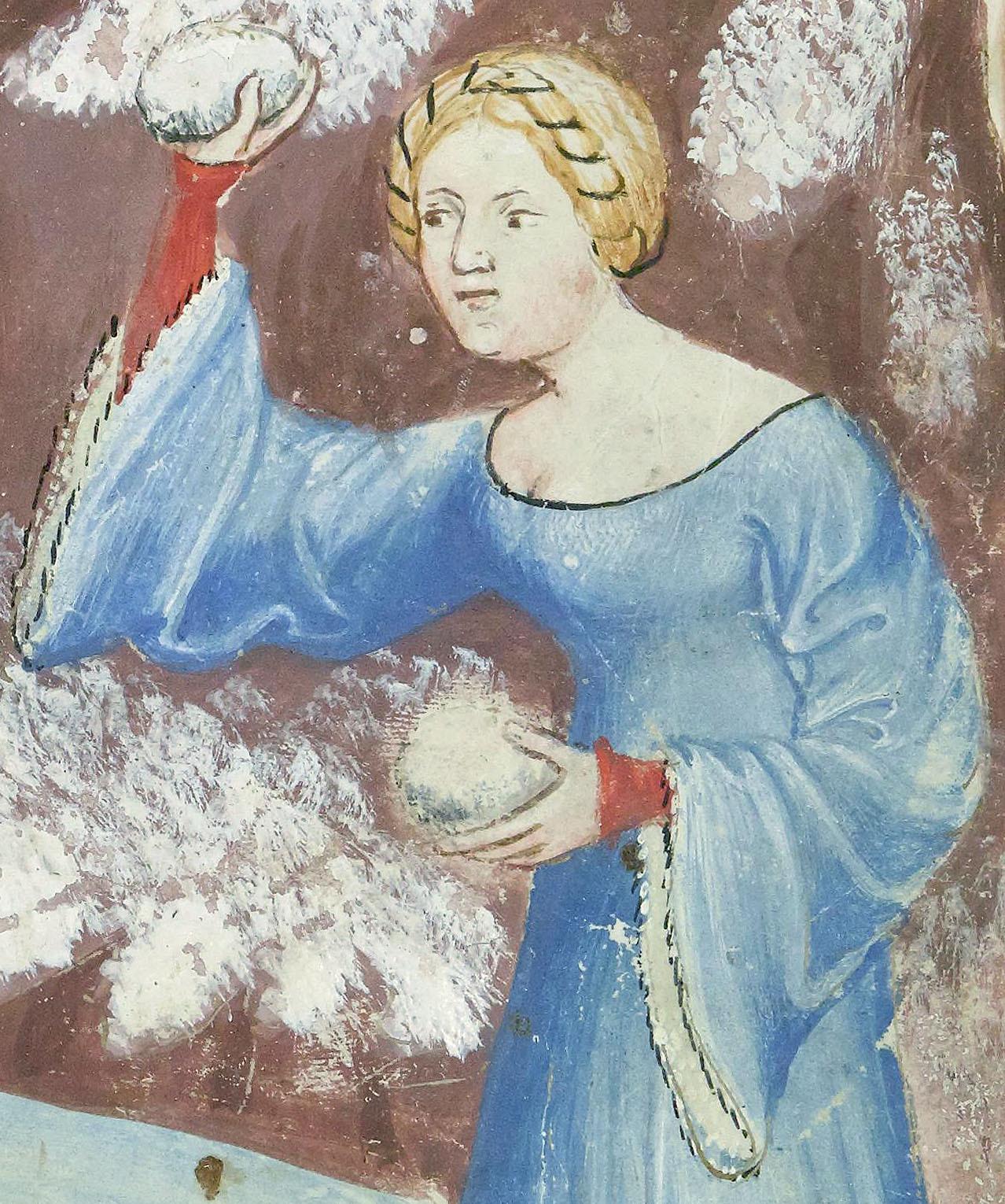 Snowball fight. Tacuinum Sanitatis, Milan or Pavia ca. 1390-1400. BnF, Nouvelle acquisition latine 1673, fol. 96v.