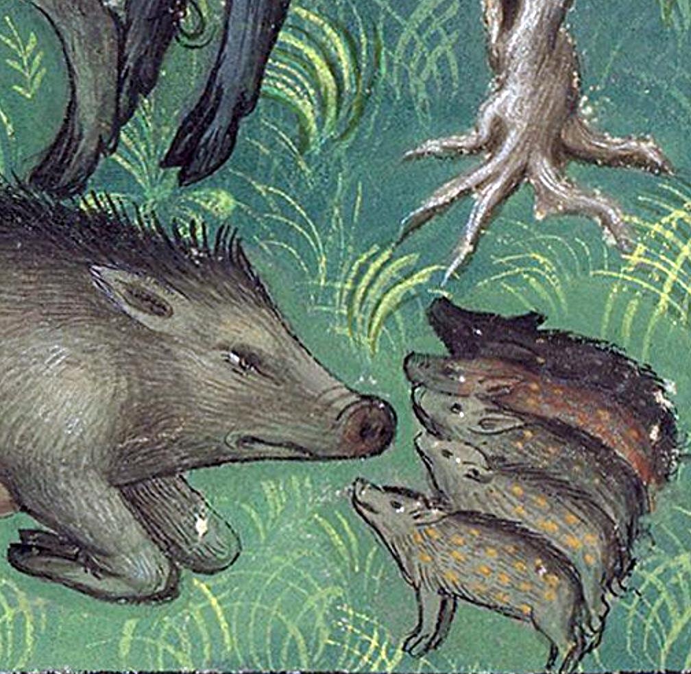 Listen up, piglets! Gaston Phoebus, Le Livre de la chasse, Paris ca. 1407. NY, Morgan, MS M. 1044, fol. 20v.