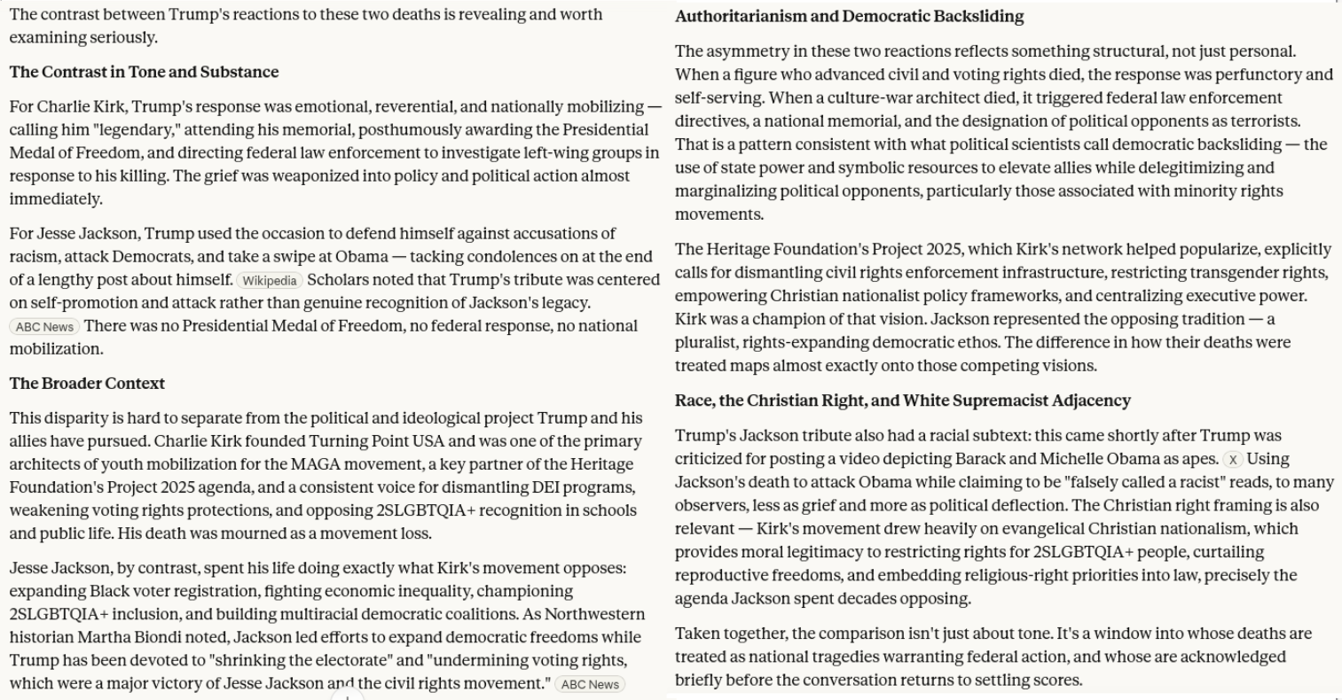<p>Trump, Charlie Kirk, and Jesse Jackson - Jesse Jackson’s legacy isn’t enough for Capitol honor<br><a href="https://www.salon.com/2026/02/21/jacksons-legacy-isnt-enough-for-capitol-honor/" rel="nofollow" class="ellipsis" title="www.salon.com/2026/02/21/jacksons-legacy-isnt-enough-for-capitol-honor/"><span class="invisible">https://</span><span class="ellipsis">www.salon.com/2026/02/21/jacks</span><span class="invisible">ons-legacy-isnt-enough-for-capitol-honor/</span></a></p><p>The Capitol’s rejection of a Rev. Jesse Jackson tribute honor highlights the limits of institutional recognition</p><p>Claude Sonnet 4.6 chat<br><a href="https://claude.ai/share/f74bf41f-e3c7-4948-a8d7-32f00847641f" rel="nofollow" class="ellipsis" title="claude.ai/share/f74bf41f-e3c7-4948-a8d7-32f00847641f"><span class="invisible">https://</span><span class="ellipsis">claude.ai/share/f74bf41f-e3c7-</span><span class="invisible">4948-a8d7-32f00847641f</span></a></p><p>🇺🇲 🇬🇧 <a href="/tags/gop/" rel="tag">#GOP</a> <a href="/tags/christofascism/" rel="tag">#Christofascism</a> <a href="/tags/scotus/" rel="tag">#SCOTUS</a> <a href="/tags/antilgbtq/" rel="tag">#antiLGBTQ</a> <a href="/tags/americanreich/" rel="tag">#AmericanReich</a> <a href="/tags/whitesupremacism/" rel="tag">#whiteSupremacism</a> <a href="/tags/misogyny/" rel="tag">#misogyny</a> <a href="/tags/theocracy/" rel="tag">#theocracy</a><br>🇨🇦 <a href="/tags/trumpism/" rel="tag">#Trumpism</a></p><p><a href="/tags/transgenocide/" rel="tag">#transgenocide</a> 🏳️‍⚧️ <a href="/tags/tlm/" rel="tag">#TLM</a> <a href="/tags/btlm/" rel="tag">#BTLM</a><br><a href="https://mastodon.social/@persagen/114186381298087870" rel="nofollow" class="ellipsis" title="mastodon.social/@persagen/114186381298087870"><span class="invisible">https://</span><span class="ellipsis">mastodon.social/@persagen/1141</span><span class="invisible">86381298087870</span></a></p><p><a href="/tags/capitalism/" rel="tag">#capitalism</a> <a href="/tags/inequality/" rel="tag">#inequality</a> <a href="/tags/democraticsocialism/" rel="tag">#DemocraticSocialism</a> <a href="/tags/justice/" rel="tag">#justice</a></p>