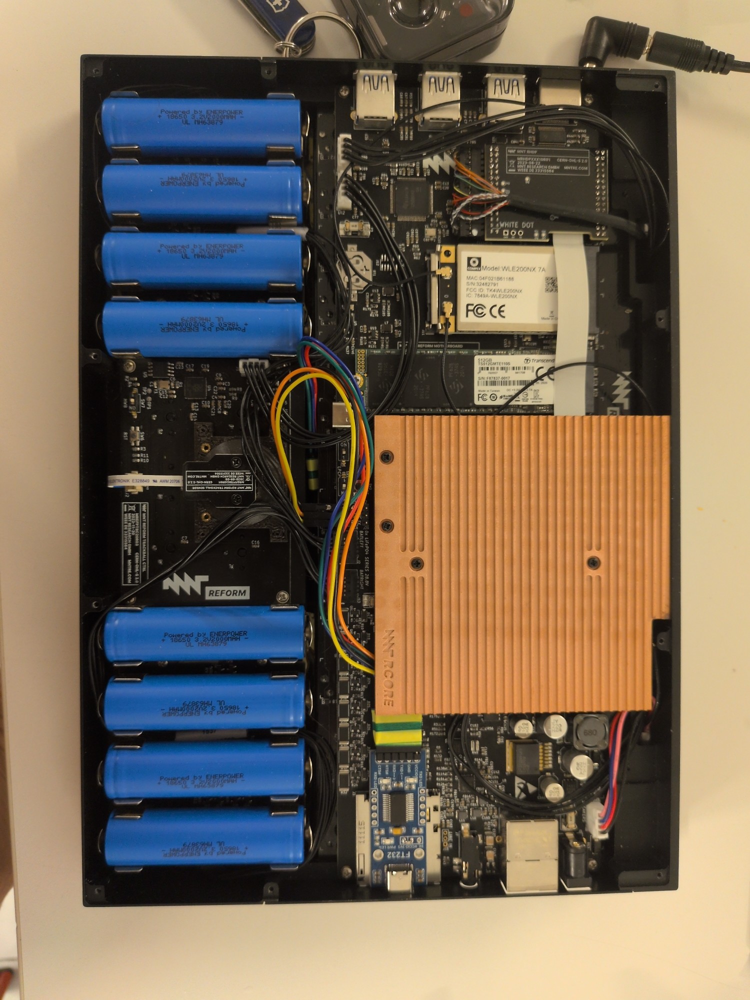 Now that I've moved the Wifi antennas into the laptop lid, I have freed up the space below the SD card reader. Taped a serial to USB converter to it, so I don't have to open up the bottom every time I want to debug boot issues. #mntreform