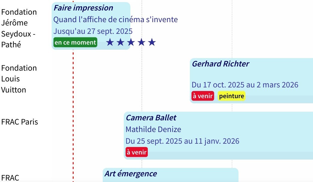 Préparez vos sorties expos pour les beaux jours à Paris ! Je tiens à jour une liste de 150 expositions en cours et à venir ! Tout est affiché en une frise chronologique sur une seule page :