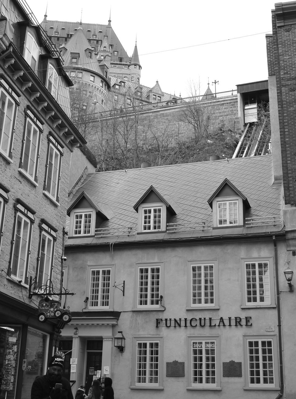 From the lower city in quartier Petit Champlain looking up at the Chateau Frontenac, in Quebec City