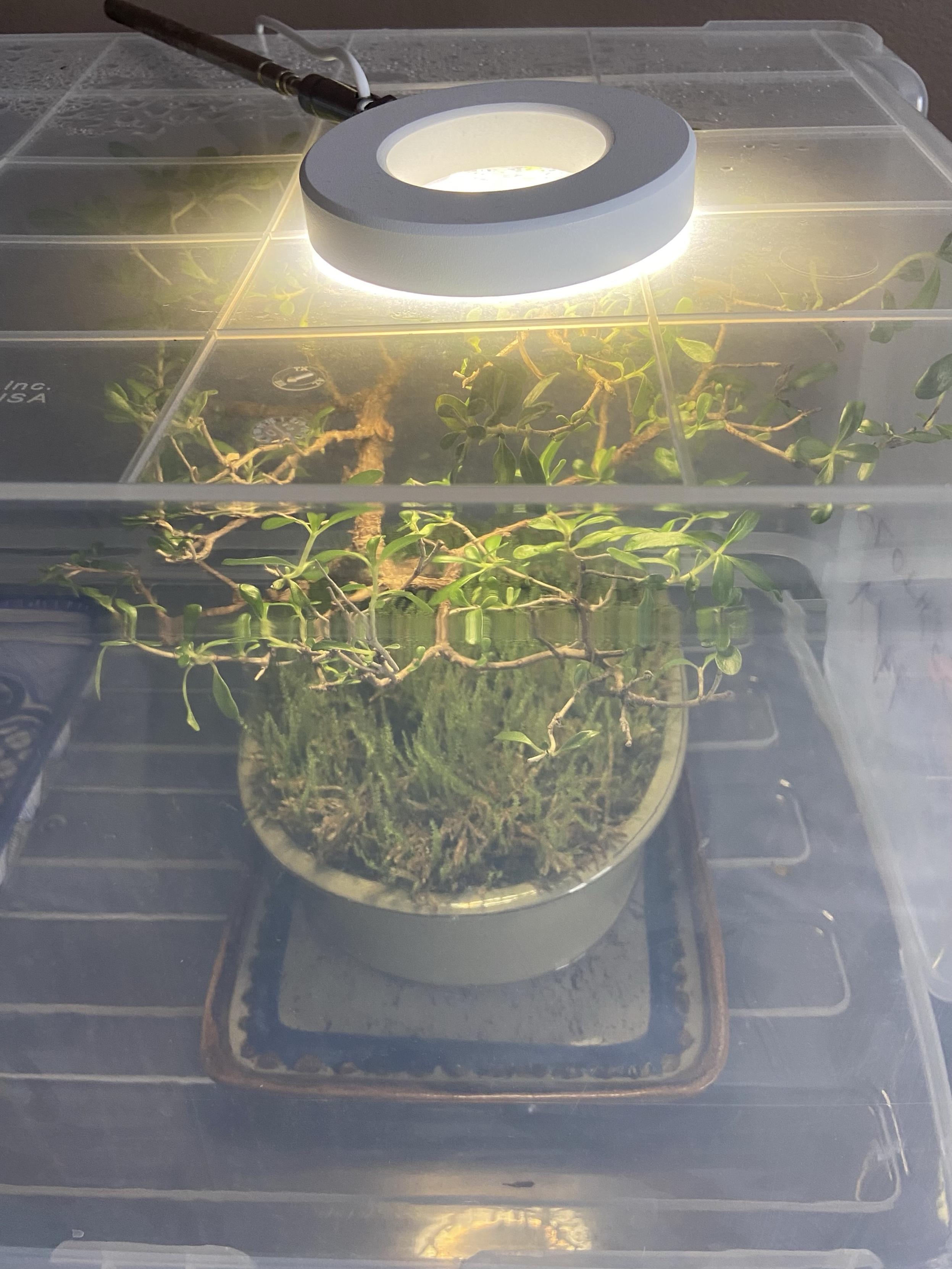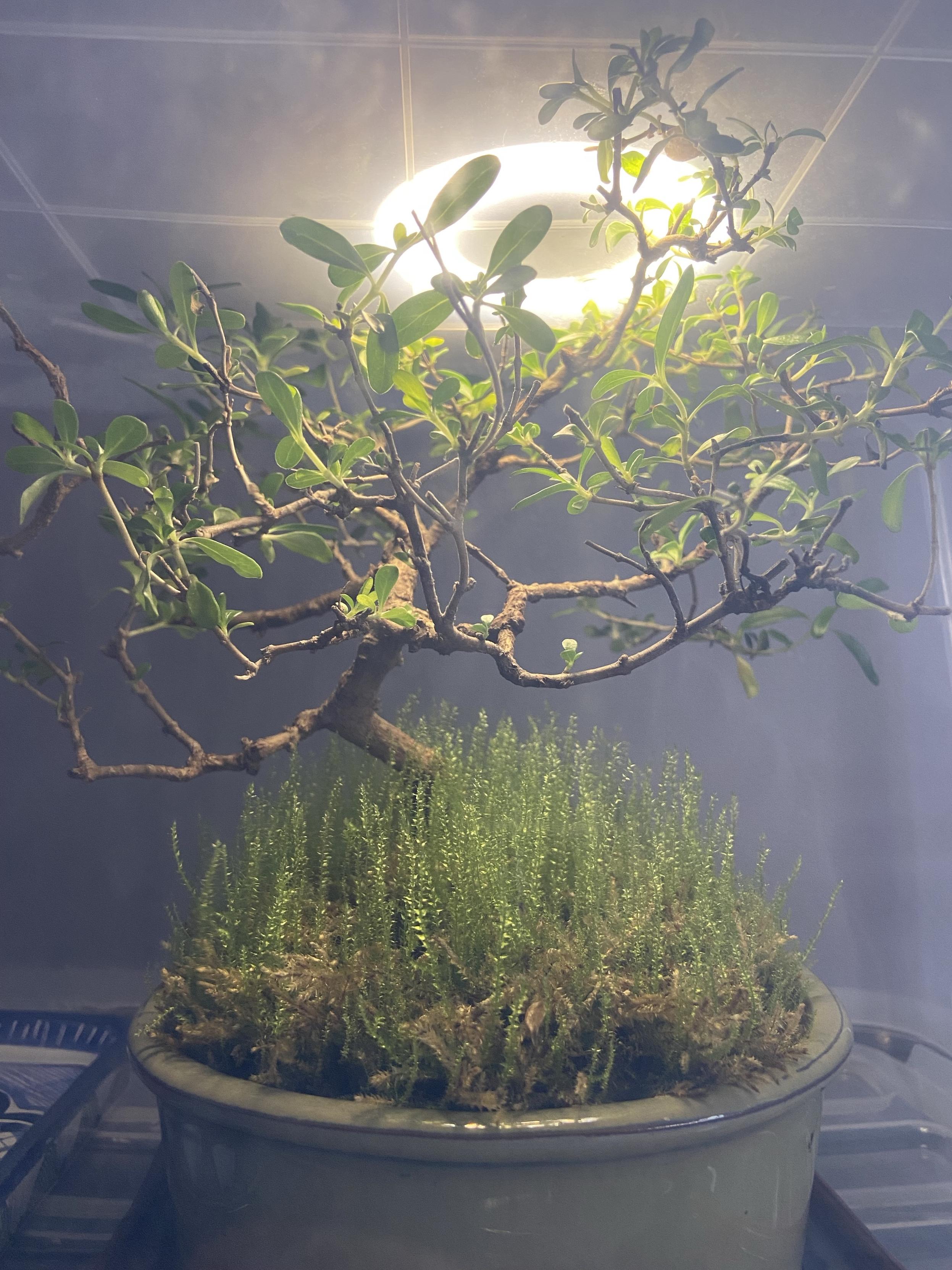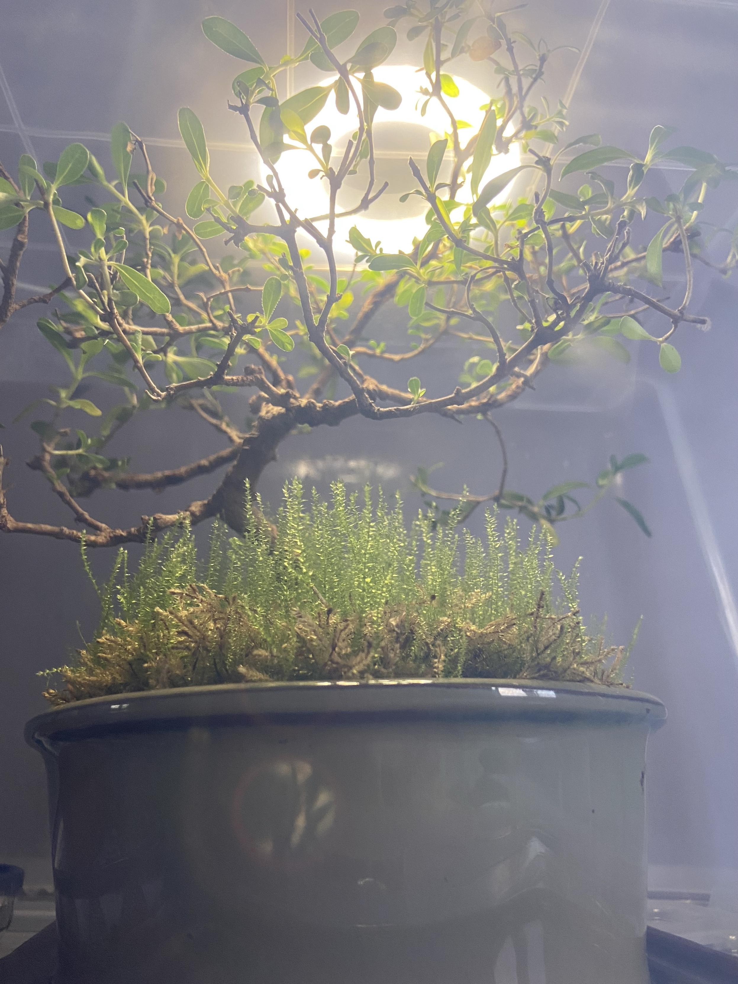 My cheap, unaesthetic, non standard, but surprisingly effective bonsai setup is particularly good for the moss. I got this moss from my own backyard where it grows like a thick low carpet but it never grows so high outdoors on its own.