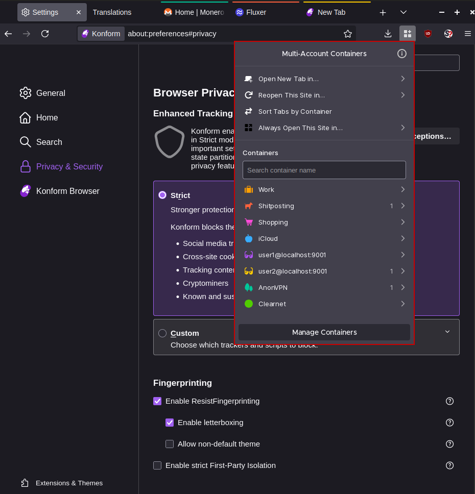 <p>Konform Browser 140.9.0-100 has been released!</p><p>See release notes for details.</p><p><a href="https://codeberg.org/konform-browser/source/releases/tag/140.9.0.100" rel="nofollow" class="ellipsis" title="codeberg.org/konform-browser/source/releases/tag/140.9.0.100"><span class="invisible">https://</span><span class="ellipsis">codeberg.org/konform-browser/s</span><span class="invisible">ource/releases/tag/140.9.0.100</span></a></p><p>Besides latest security fixes from <a href="/tags/mozilla/" rel="tag">#mozilla</a> there is a bunch of updates from <a href="/tags/konform/" rel="tag">#konform</a> <a href="/tags/browser/" rel="tag">#browser</a>. To name a few:</p><p>- Reorganized Security Settings with new global configuration for WASM, JIT, WebRTC, WebGPU, Geolocation, DOM Push, etc...</p><p>- Security Settings also expose UI for enabling First-Party Isolation (same behavior as Tor Browser) and tweaking Enhanced Tracking Protection.</p><p>- Bundled depropped Multi-Account Containers allows configuring per-container proxies and makes container tabs part of core browser experience without having to install telemetry-laden addons.</p><p>- Profile Import now supports importing profiles from <a href="/tags/firefox/" rel="tag">#firefox</a> and compatible <a href="/tags/browsers/" rel="tag">#browsers</a> (<a href="/tags/firefox_esr/" rel="tag">#firefox_esr</a>, <a href="/tags/floorp/" rel="tag">#floorp</a>, <a href="/tags/ironfox/" rel="tag">#ironfox</a>, <a href="/tags/librewolf/" rel="tag">#librewolf</a>, <a href="/tags/midori/" rel="tag">#midori</a>, <a href="/tags/palemoon/" rel="tag">#palemoon</a>, <a href="/tags/waterfox/" rel="tag">#waterfox</a>, <a href="/tags/zenbrowser/" rel="tag">#zenbrowser</a>)</p><p>- Spoofing of Navigator.sendBeacon.</p><p>- <a href="/tags/privacy/" rel="tag">#privacy</a> improvements and defense-in-depth</p><p>- Various bugfixes and minor improvements</p><p>Check it out and spread the word ☮️ 🕉️</p>
