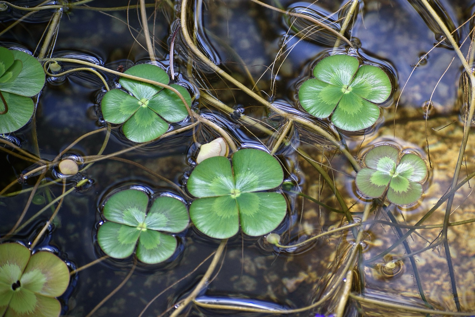 Waterclover floats in summer sun filtered through glass.