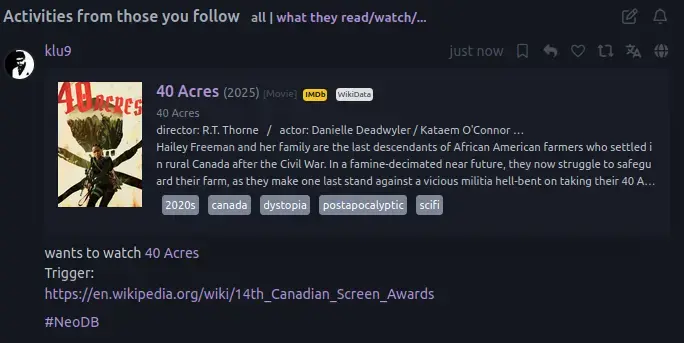 <p>wants to watch <a href="https://neodb.social/search?r=1&q=https://eggplant.place/tv/53Pm1mqqRAQfczz2E35e8S" rel="nofollow">Less Than Kind</a> <br>Trigger:<br><a href="https://mastodon.sdf.org/@bobjonkman/113564552874767537" rel="nofollow" class="ellipsis" title="mastodon.sdf.org/@bobjonkman/113564552874767537"><span class="invisible">https://</span><span class="ellipsis">mastodon.sdf.org/@bobjonkman/1</span><span class="invisible">13564552874767537</span></a></p><p><a href="/tags/neodb/" rel="tag">#NeoDB</a></p>