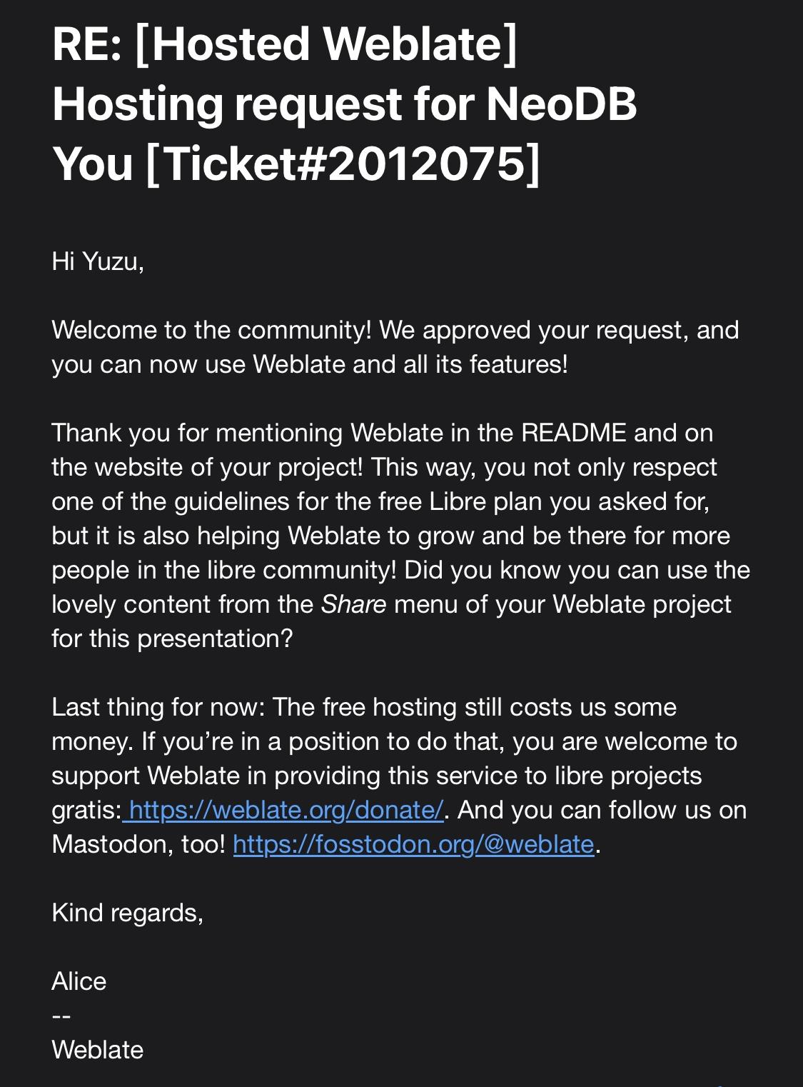 Today @weblate approves my request for hosting this project for free on the hosted weblate, aka libre plan. Many thanks!