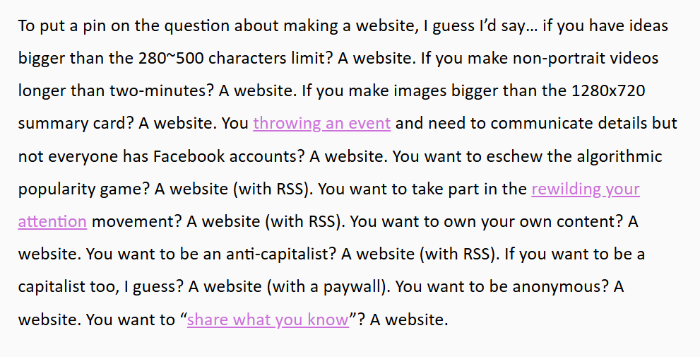 "What if we didn’t think of a website as one thing that answers to a million people? What if instead, there were millions of websites, each one handmade by a single person?"