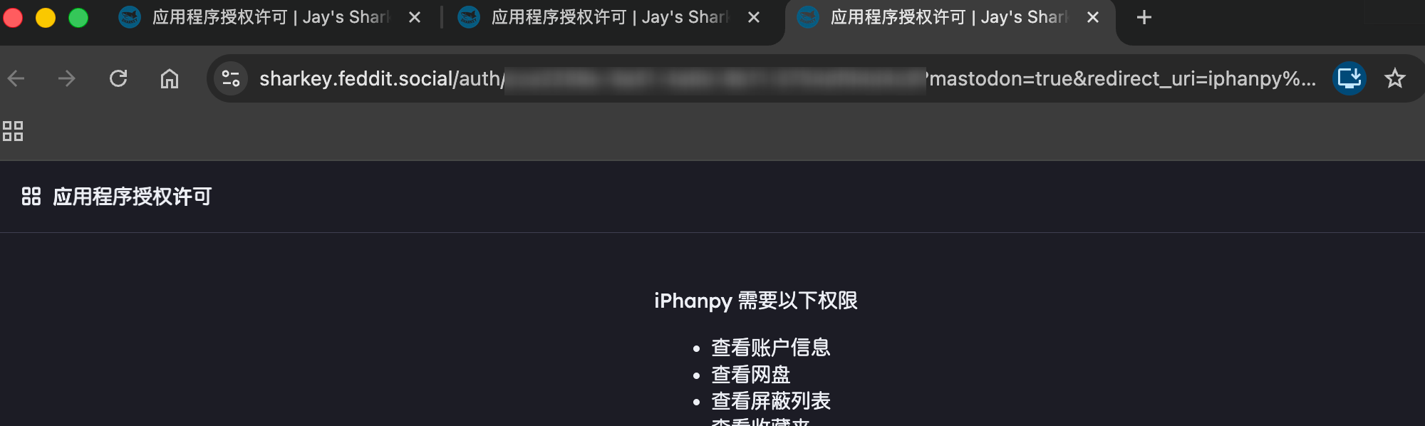 The iPhanpy app downloaded from the Mac App Store can log in to Selfhost's Mastodon and Sharkey (GoToSocial still doesn't work); however, strangely, it opens three browser authentication pages at once.