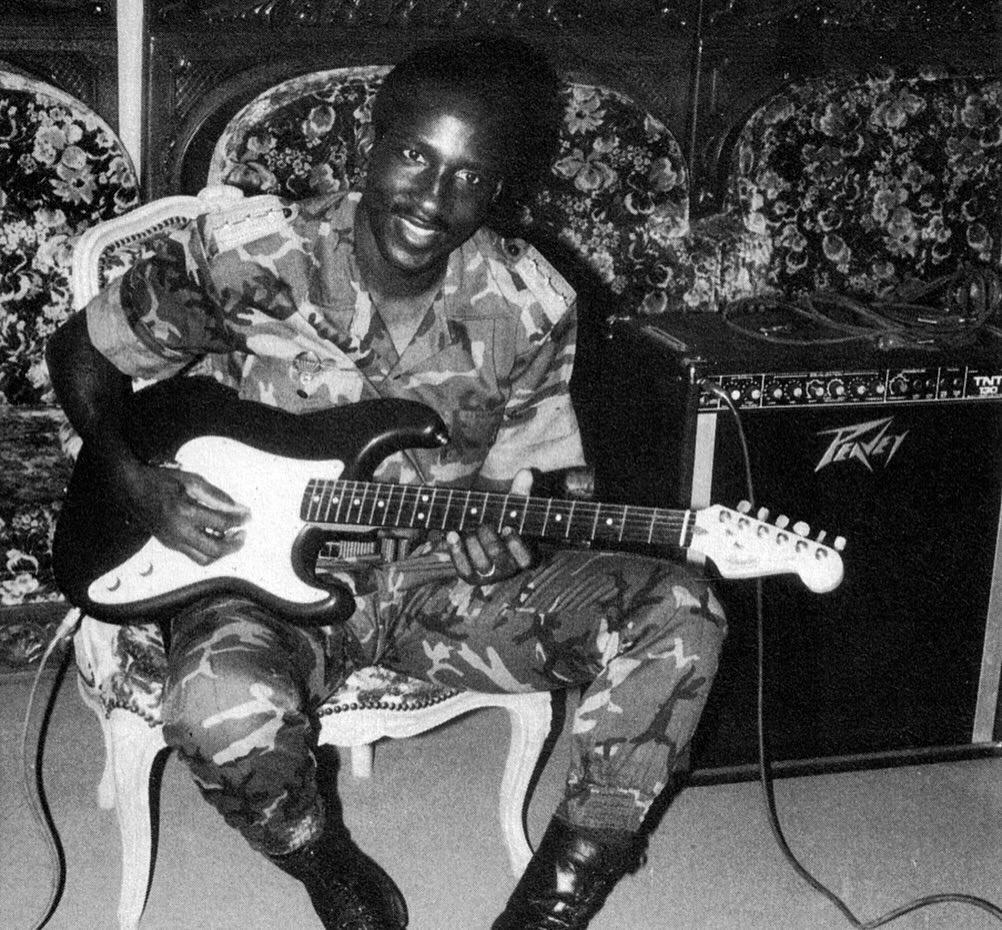 "Thomas Sankara playing his red strat into a Peavey amp."