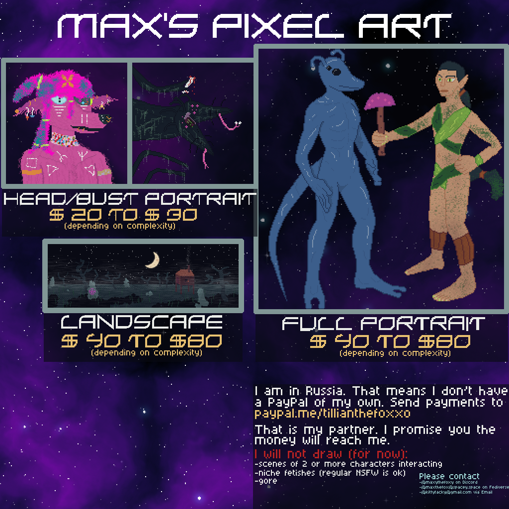 DM me on Discord (@maxythefoxy) or message this Fedi account to request a commission.
