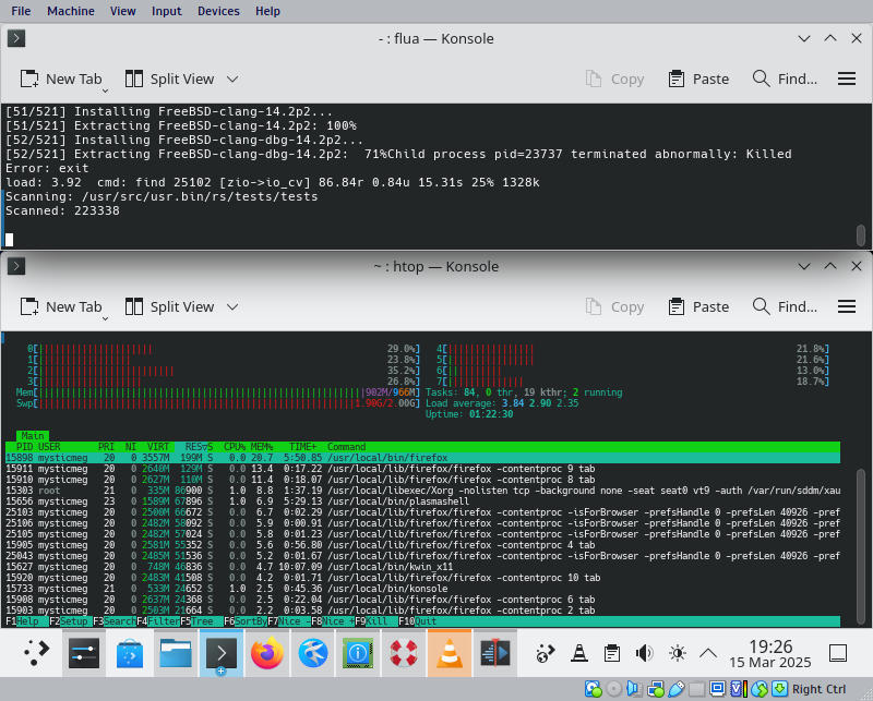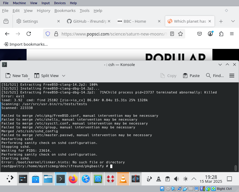 Shots 1 and 2: I forced a series of errors by running pkbasify (in Konsole, alongside various other applications) with insufficient free memory and insufficient swap space.