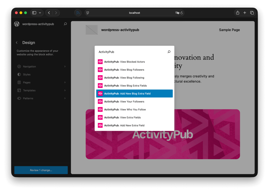 Type “ActivityPub” and you’ll see context-aware commands that adapt to your site setup and user role. Whether you’re managing a blog actor or a user actor, you can open followers and following lists, check blocked actors, jump straight to your settings, or even search and edit extra fields — all without ever leaving the Command Palette.