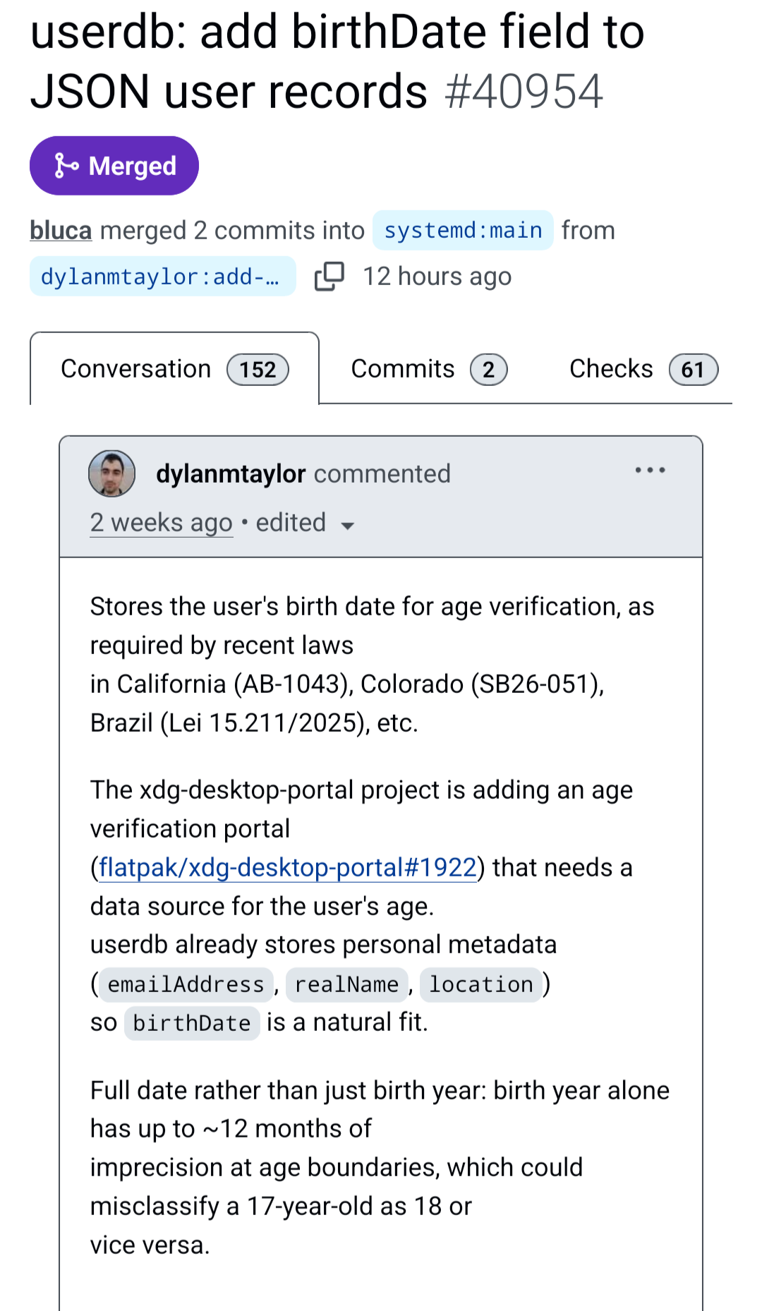 <p>They have started to store birthday info in systemd...</p><p>Are they really planning to integrate age verification in systemd too? That's terrible.</p><p><a href="/tags/systemd/" rel="tag">#systemd</a> <a href="/tags/linux/" rel="tag">#Linux</a> <a href="/tags/ageverification/" rel="tag">#AgeVerification</a> <a href="/tags/privacy/" rel="tag">#Privacy</a></p>